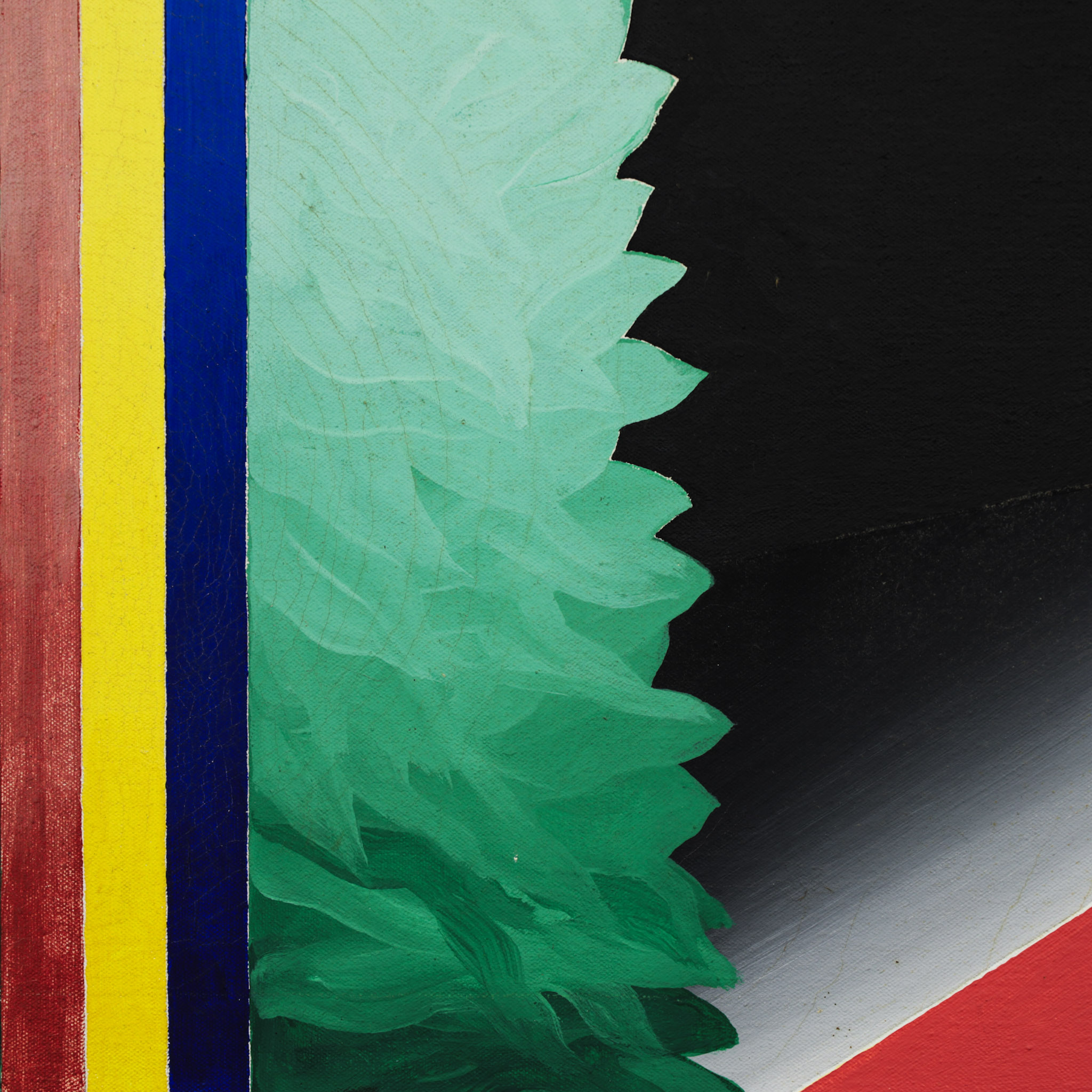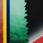 Bold diagonal planes in warm pink and red tones intersect with a dominant black horizontal field, creating a dynamic architectural framework. At the center, a layered vertical motif in green and blue gradients rises upward, softening the strict geometry and adding a sense of organic movement. The narrow bands of color accentuate the symmetry and guide the eye through the composition.