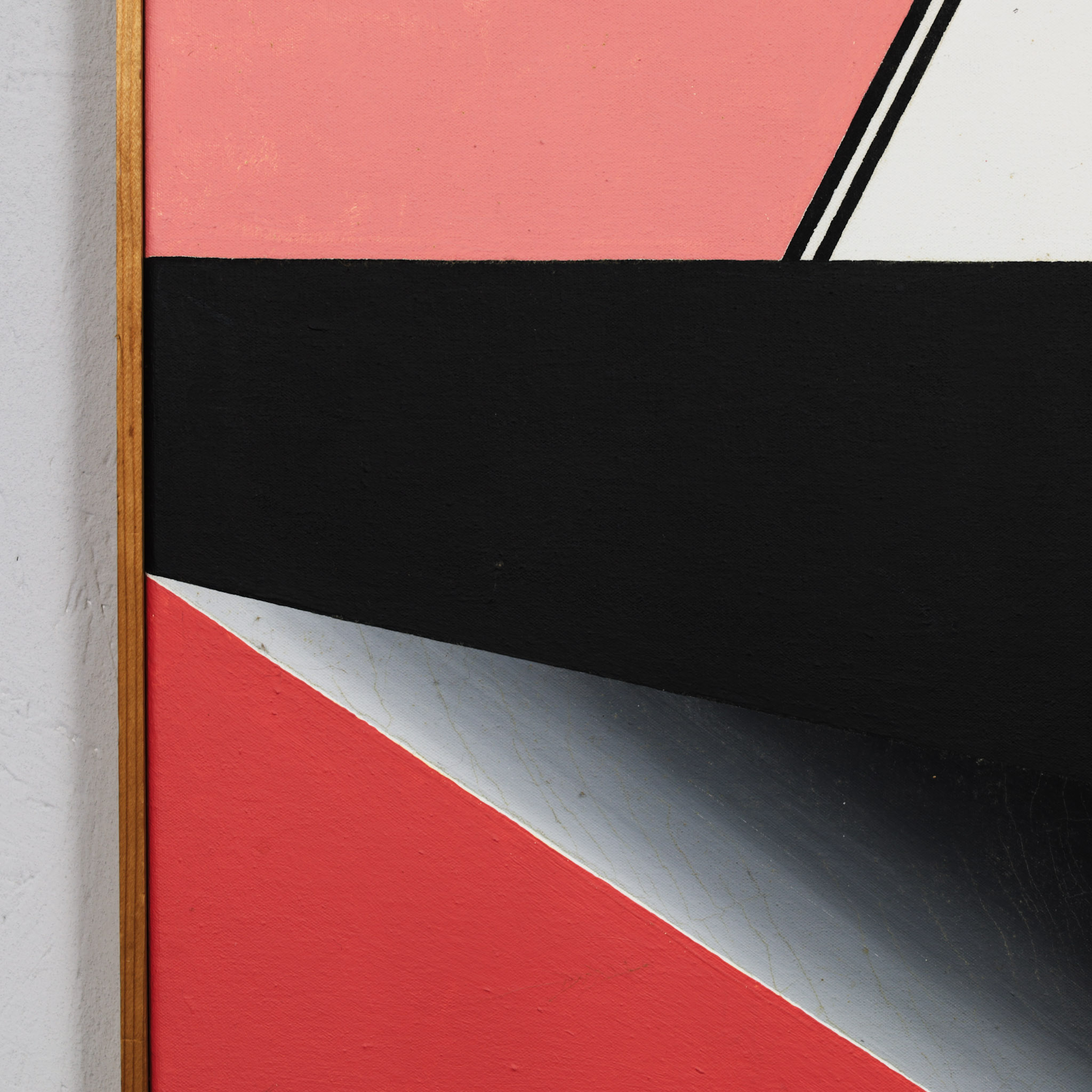 The acrylic surface retains its clarity and vibrancy, while the wooden frame provides a restrained and complementary border. The work embodies the spirit of early 1970s abstract painting in the Netherlands, where geometry, color fields and spatial illusion converge in a controlled yet expressive visual language.