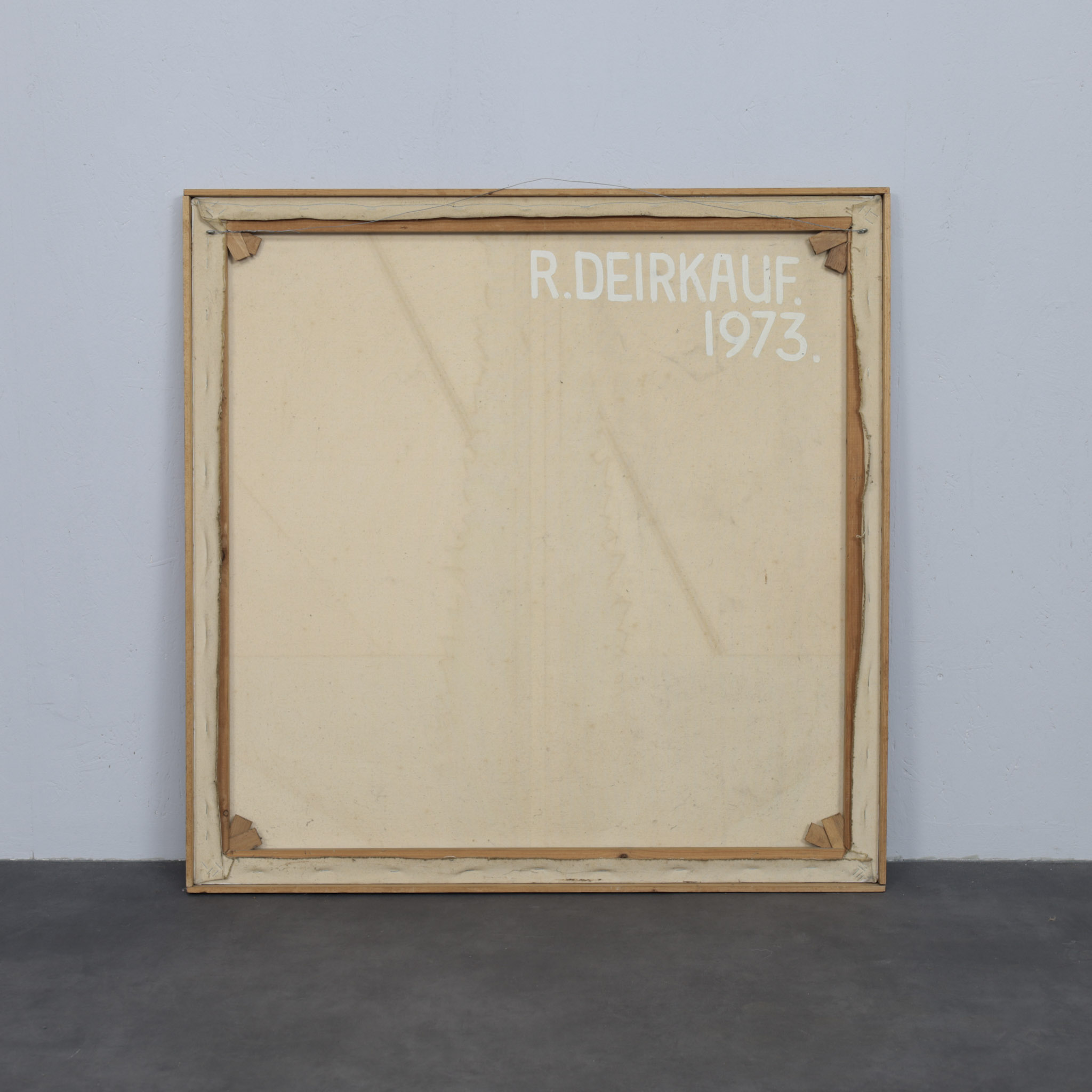 This abstract painting by Robin Deirkauf, created in 1973 in the Netherlands, reflects a strong geometric sensibility combined with a refined use of color and spatial tension. The composition is carefully structured around symmetry and contrast, balancing sharp linear elements with a central vertical form that introduces depth and rhythm.
