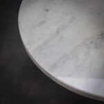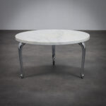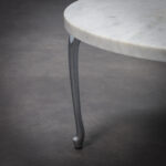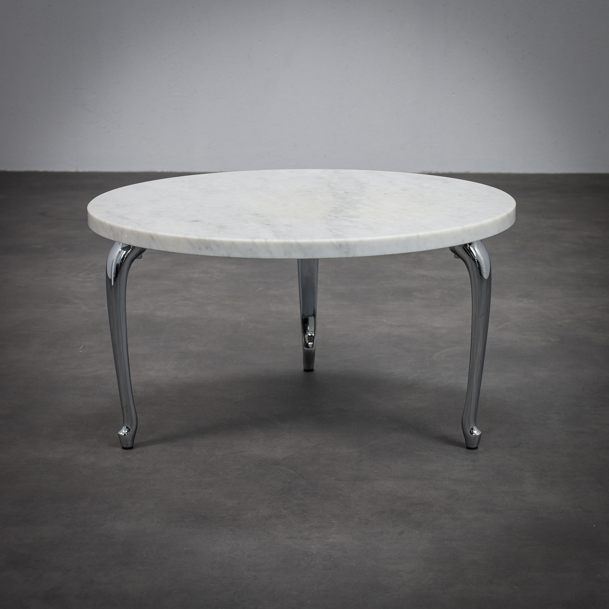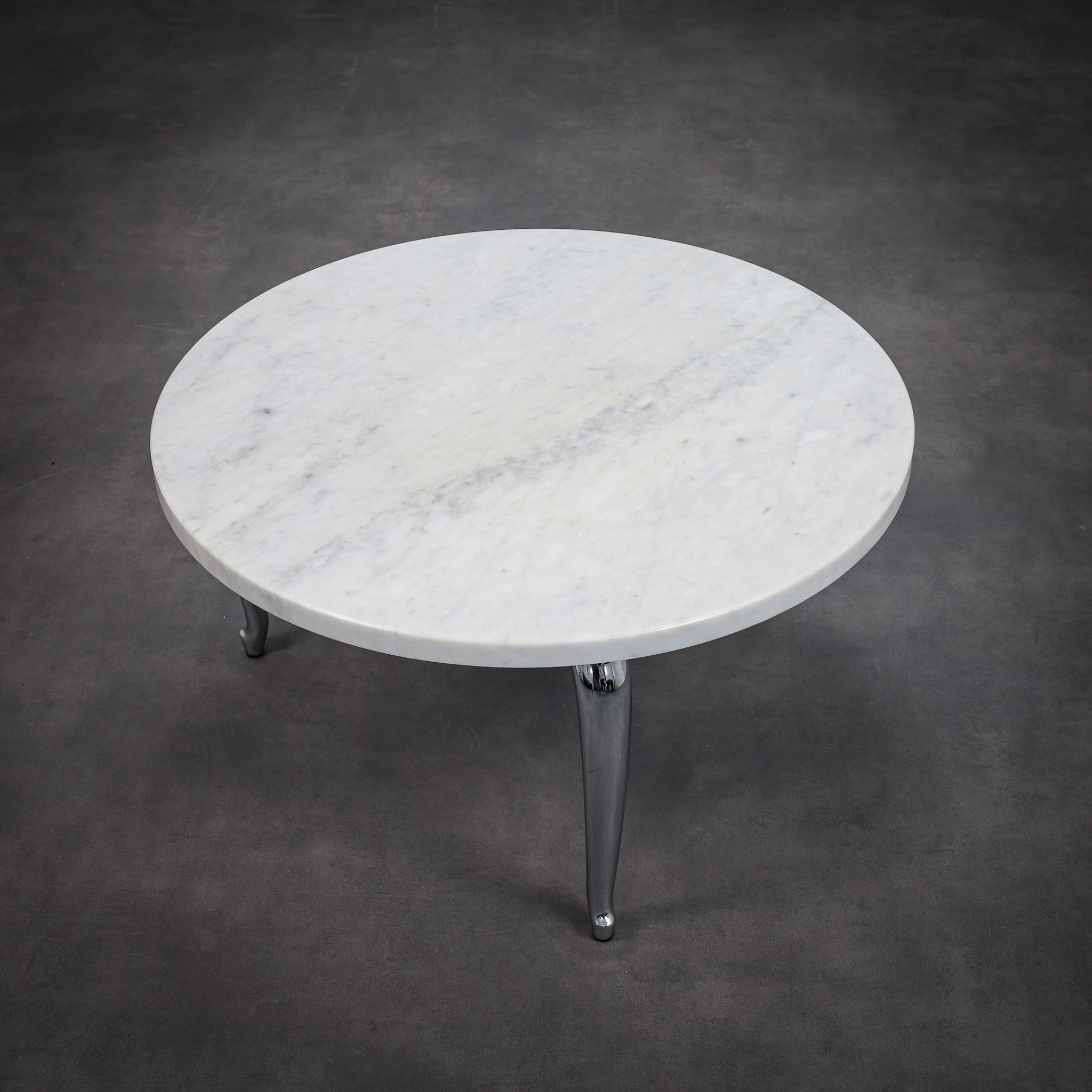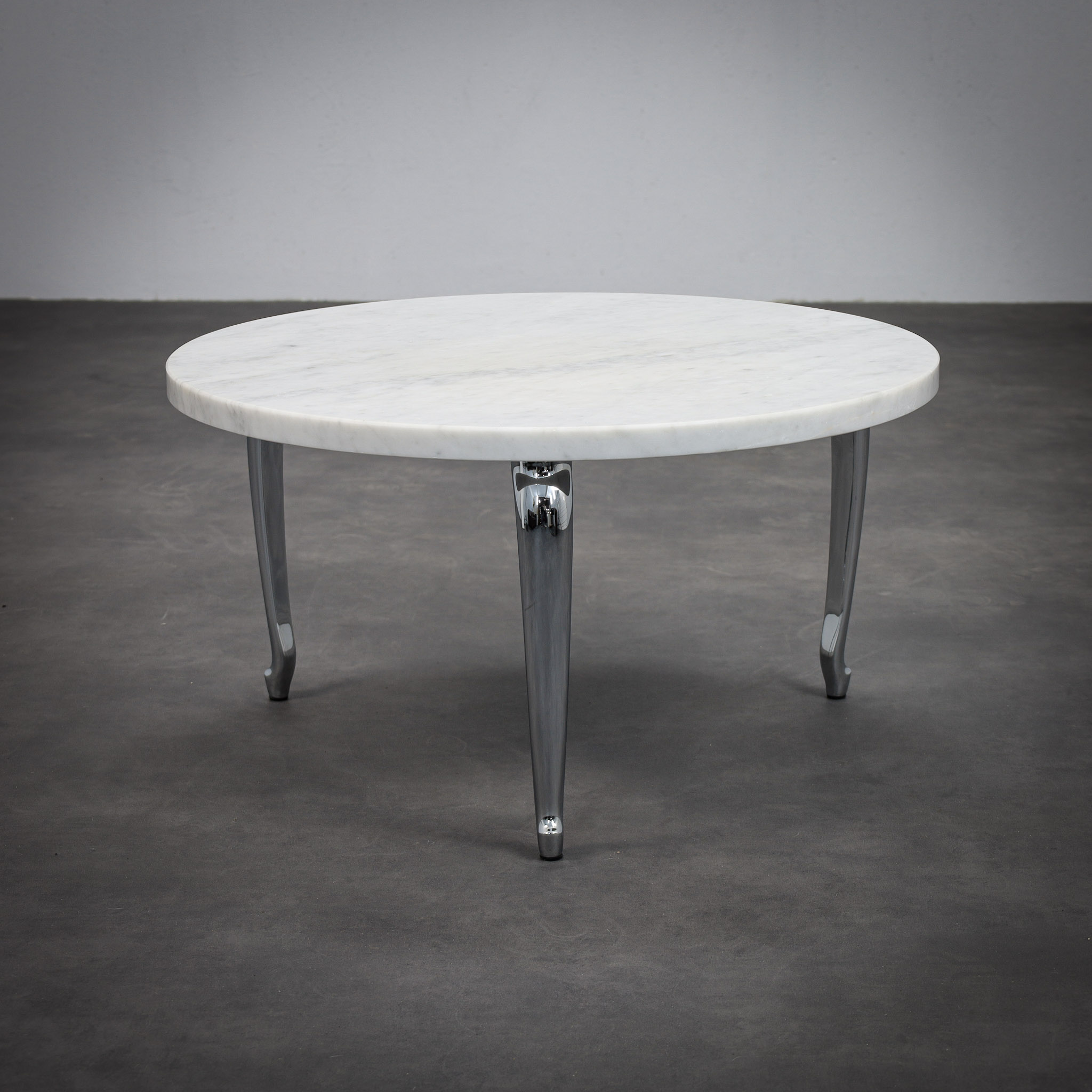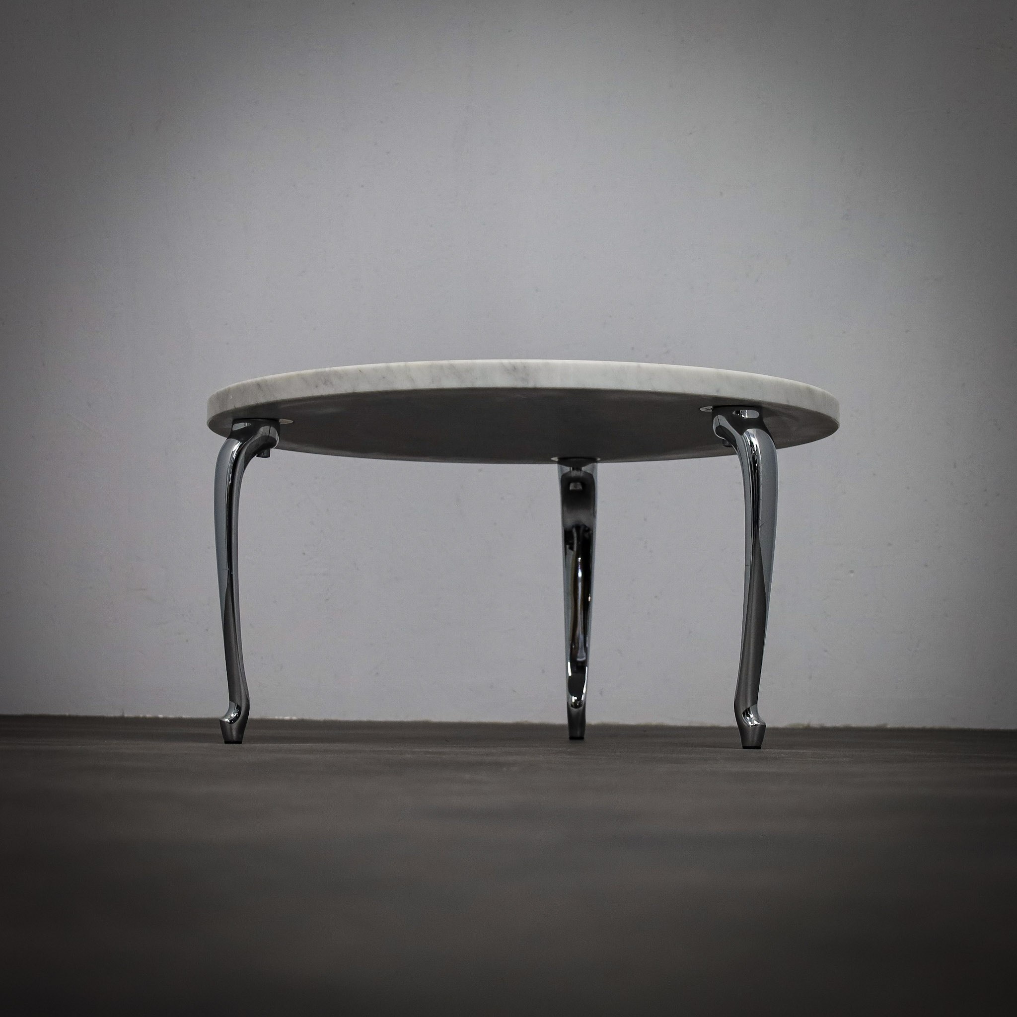 The circular marble top provides a calm and timeless surface, its natural veining introducing quiet variation and depth. Beneath it, three elongated chromed legs extend outward with a sculptural gesture, recalling the stretched proportions of a dachshund the inspiration behind the name Bassotti. The polished metal reflects light and environment, creating a dynamic dialogue between the solid stone surface and the reflective base.