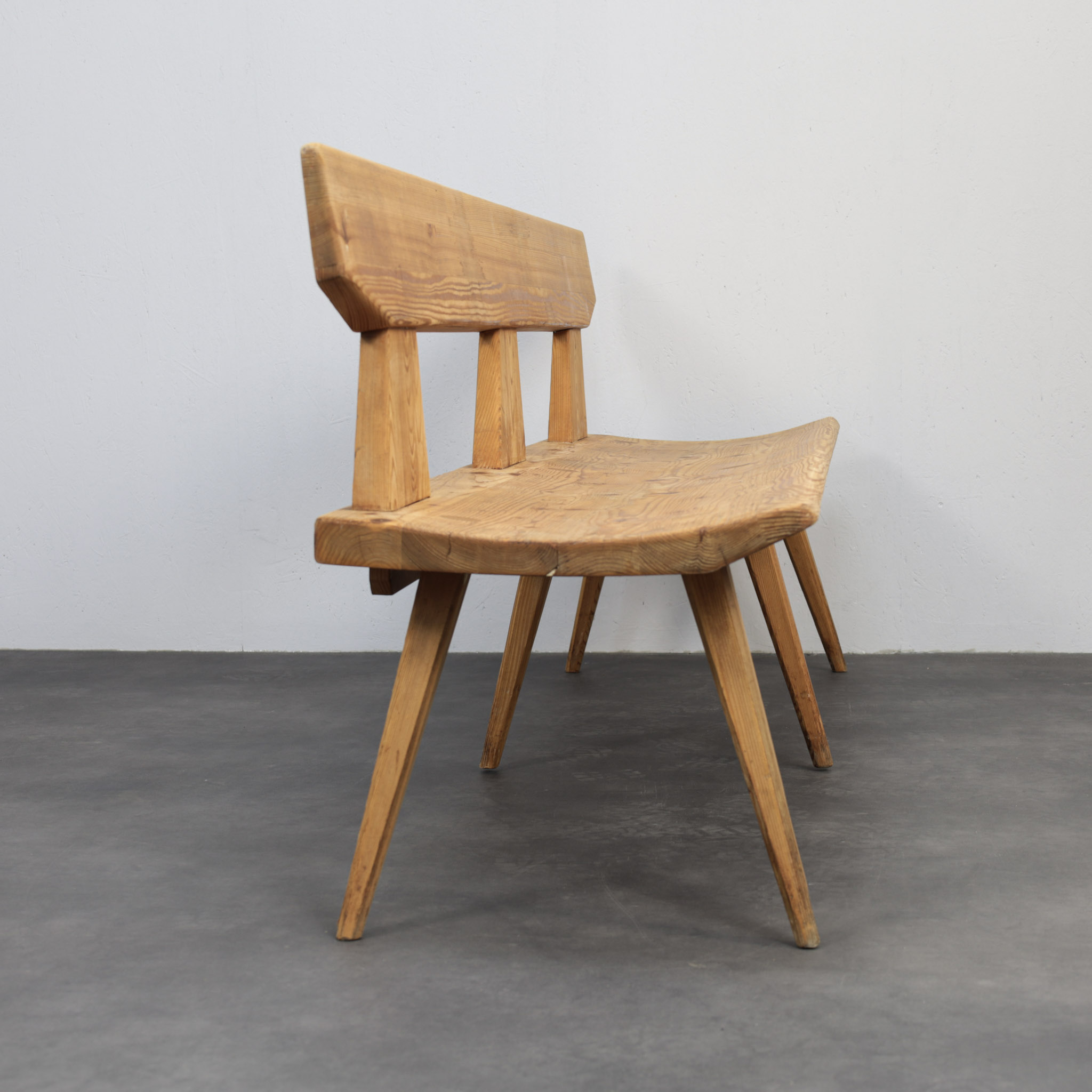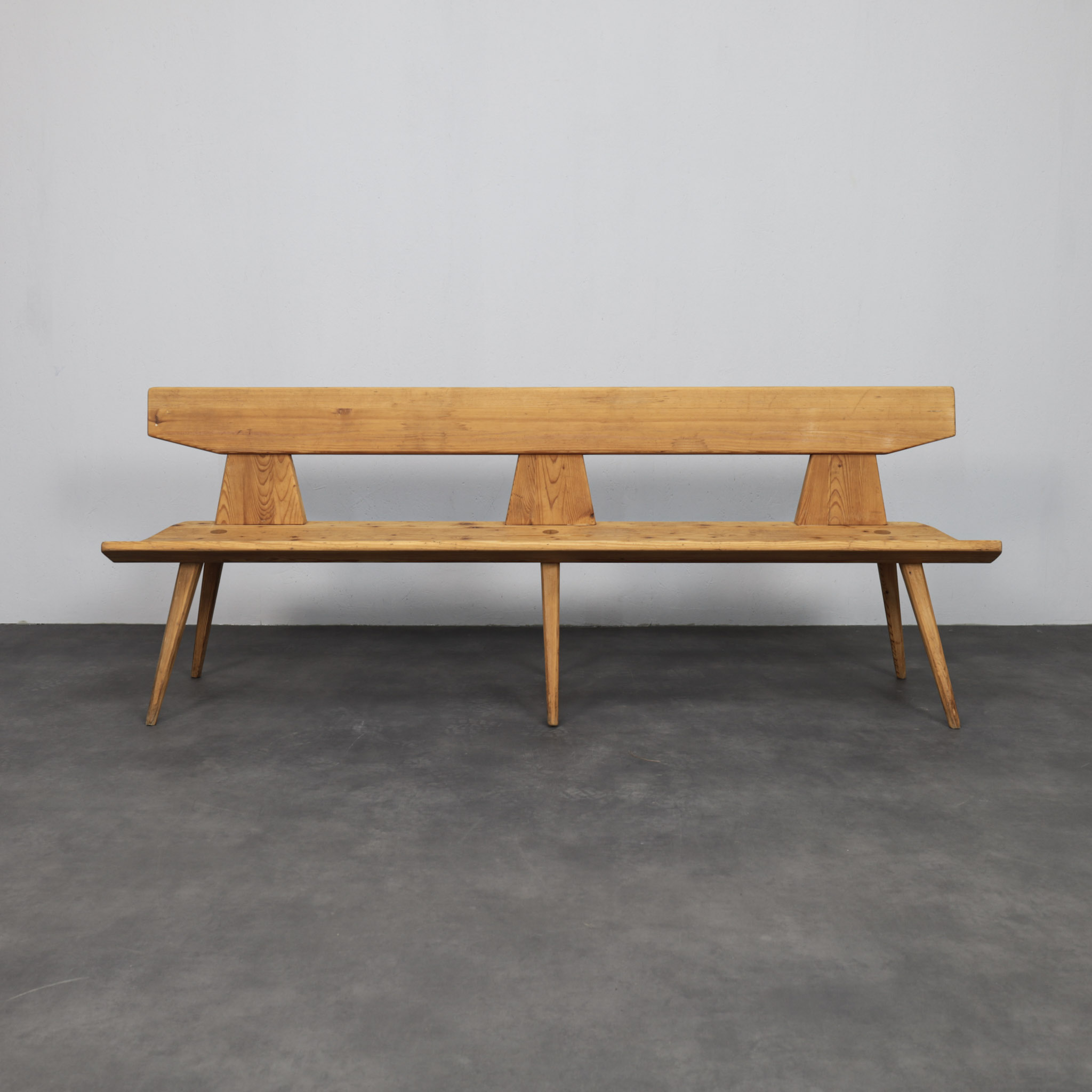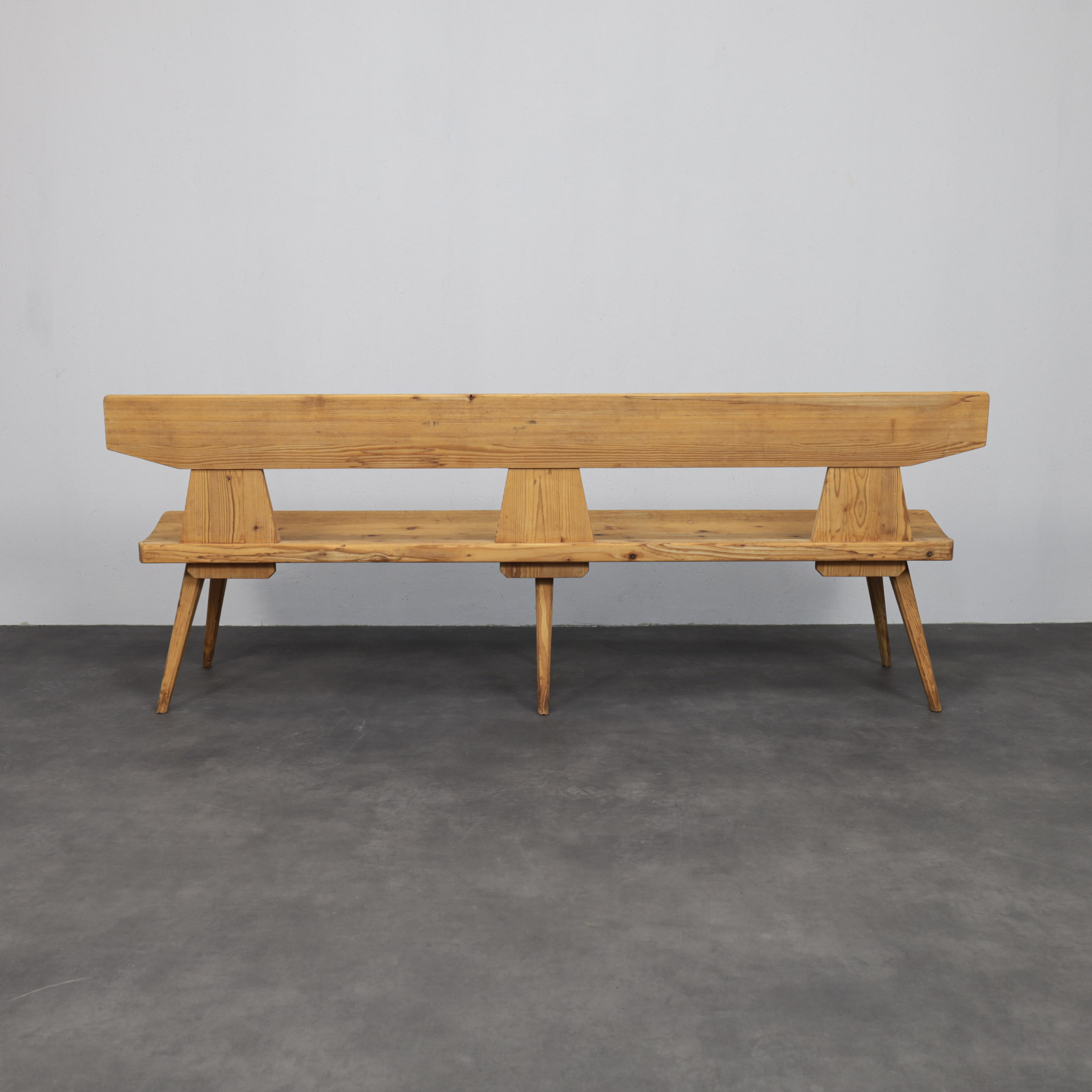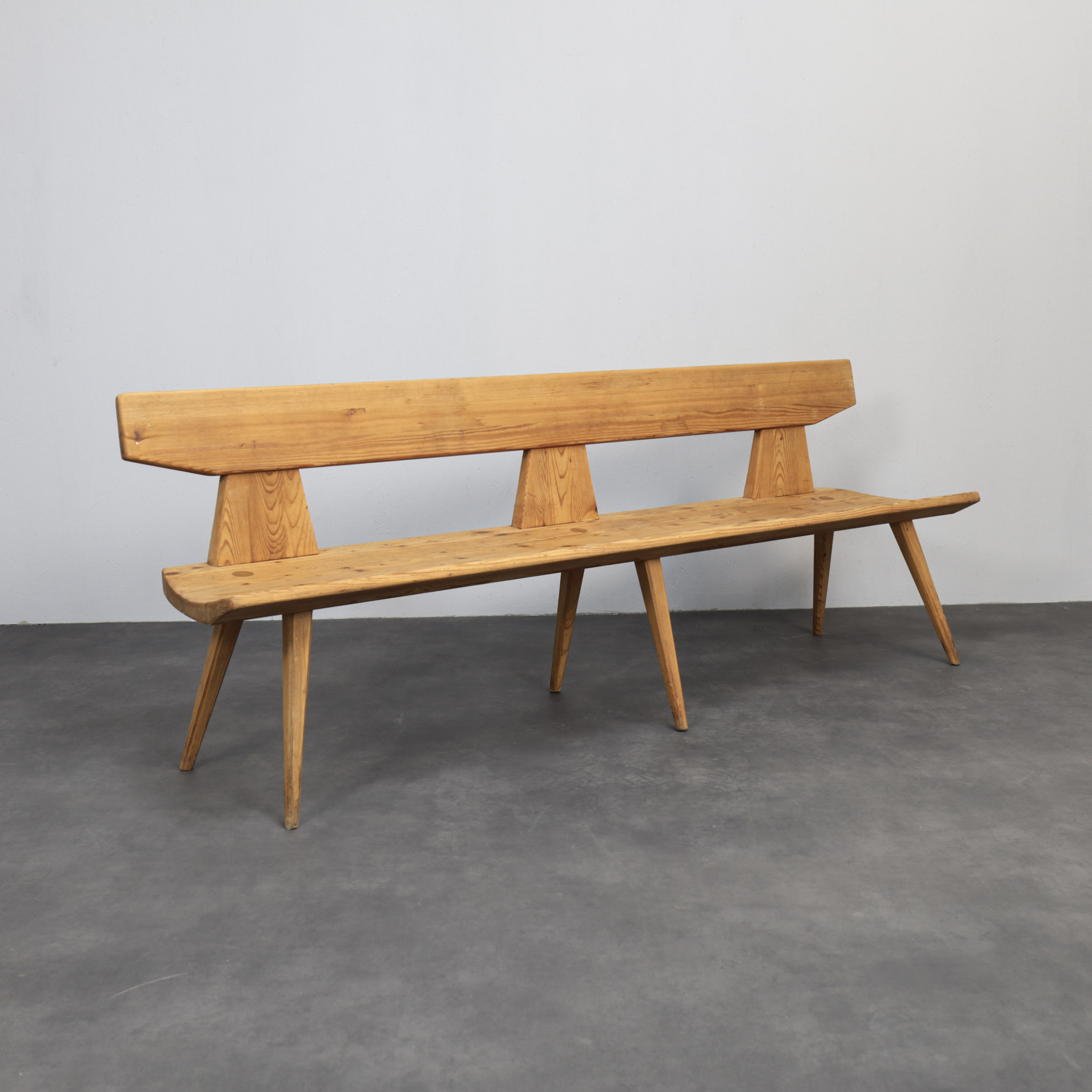 Constructed in solid pine, the bench features a long, slightly tapered backrest supported by three angular uprights. The seat plank runs uninterrupted across the length, resting on slender, outward angled legs that provide stability while maintaining visual lightness. The visible grain and natural knots enhance the material presence, giving the bench warmth and character.