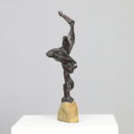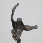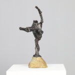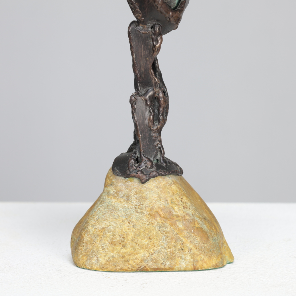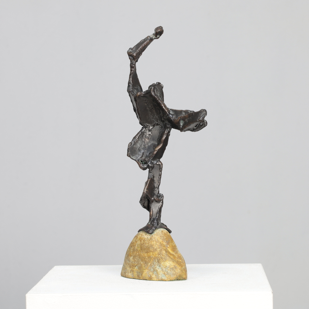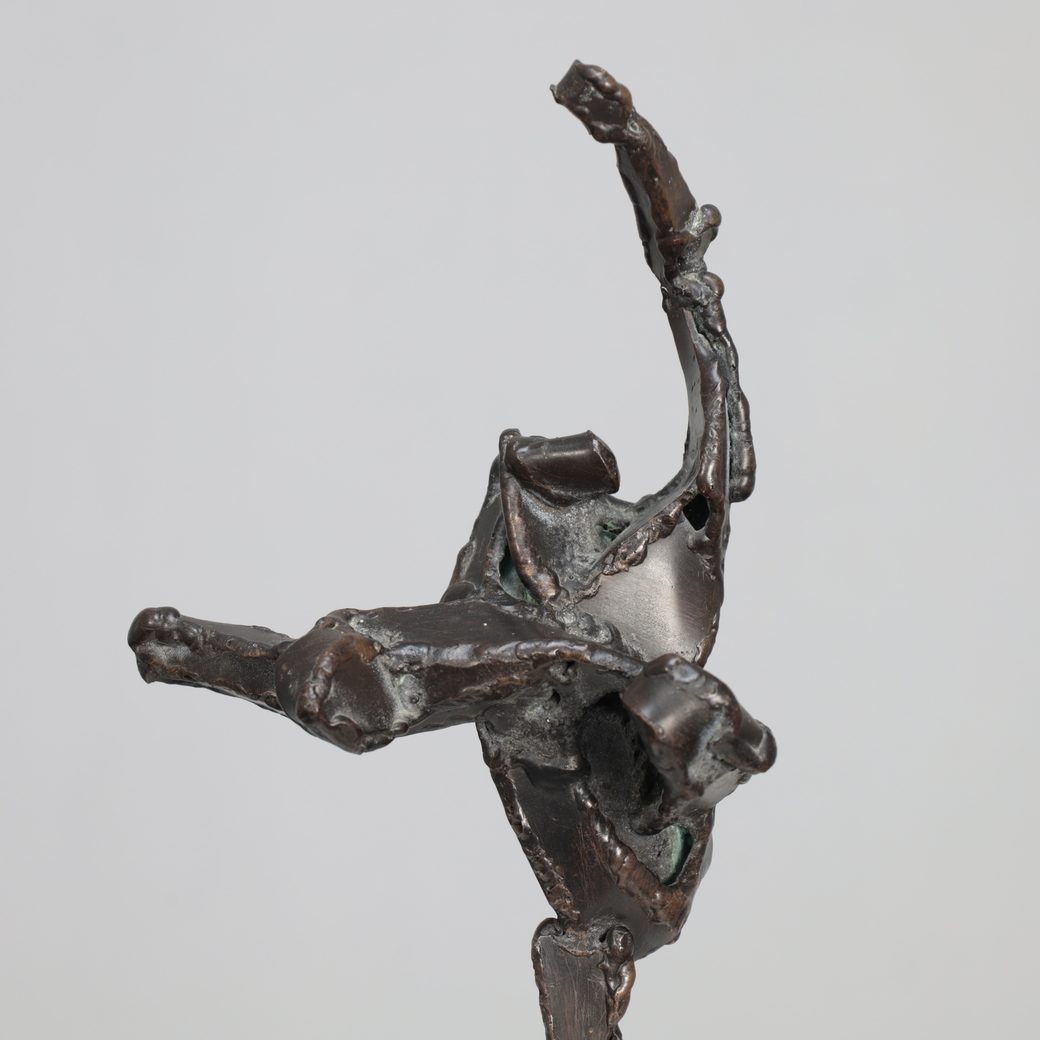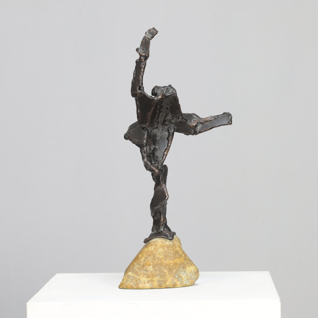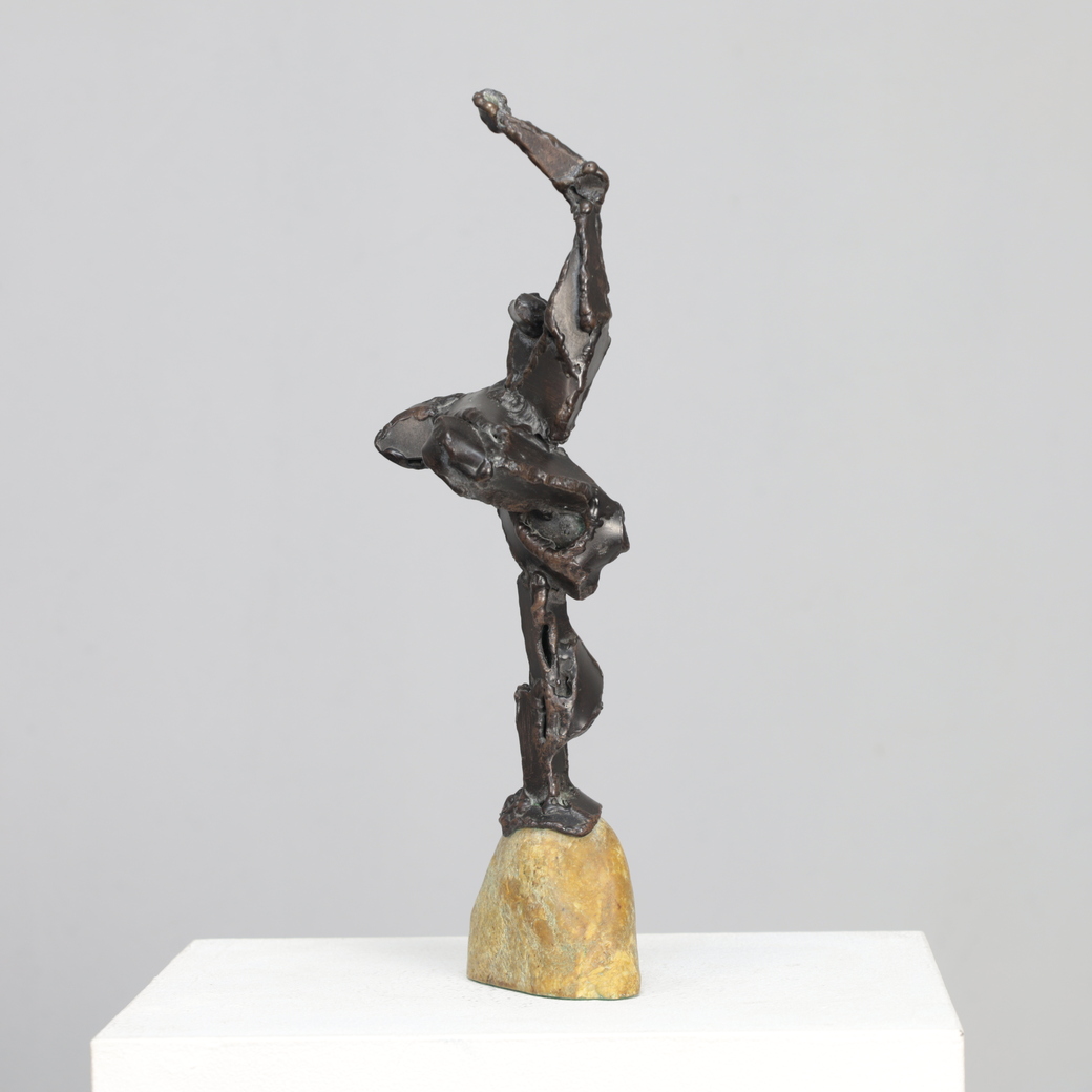 An expressive bronze sculpture by Dutch artist Hugo Hol, created in the 1970s. The figure rises dynamically from a natural stone base, its angular form and welded texture evoking both strength and motion. The piece captures a sense of upward momentum — a gesture frozen in mid-balance, full of tension and vitality.