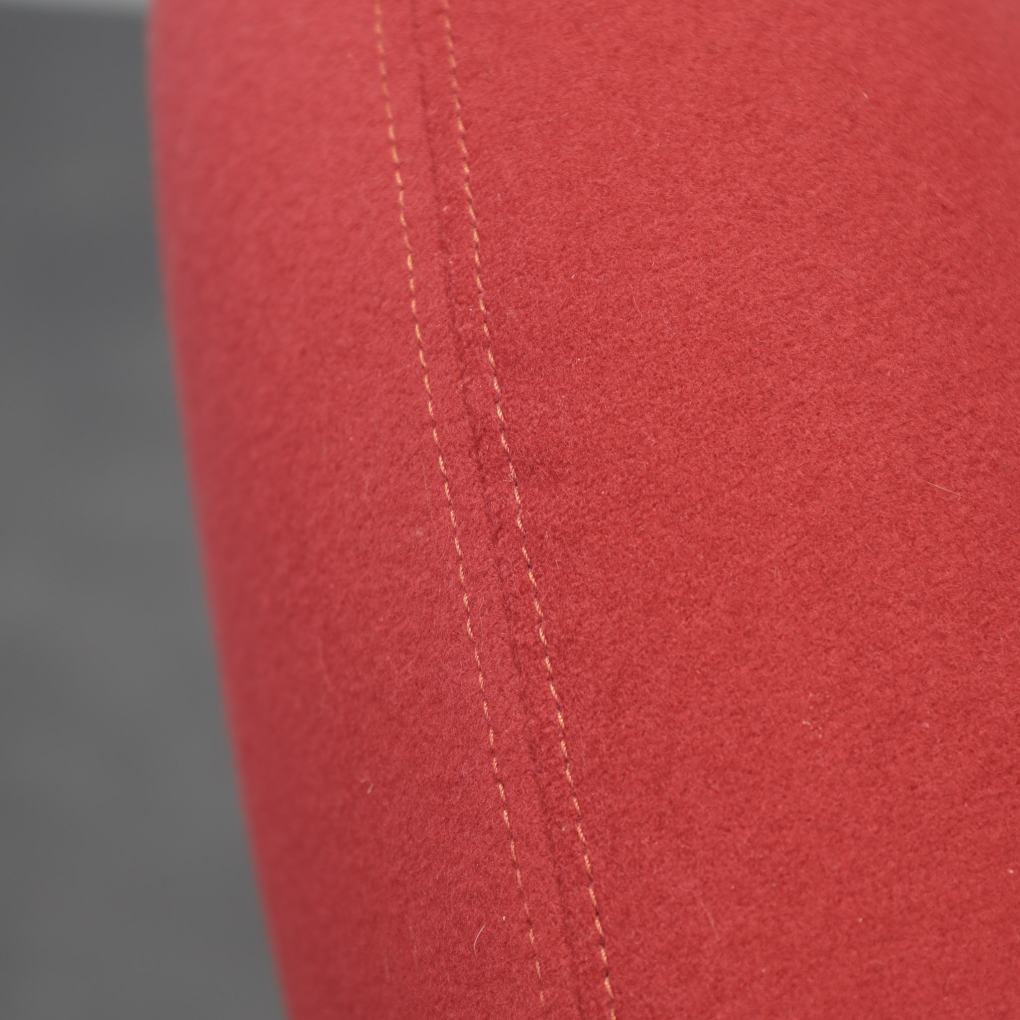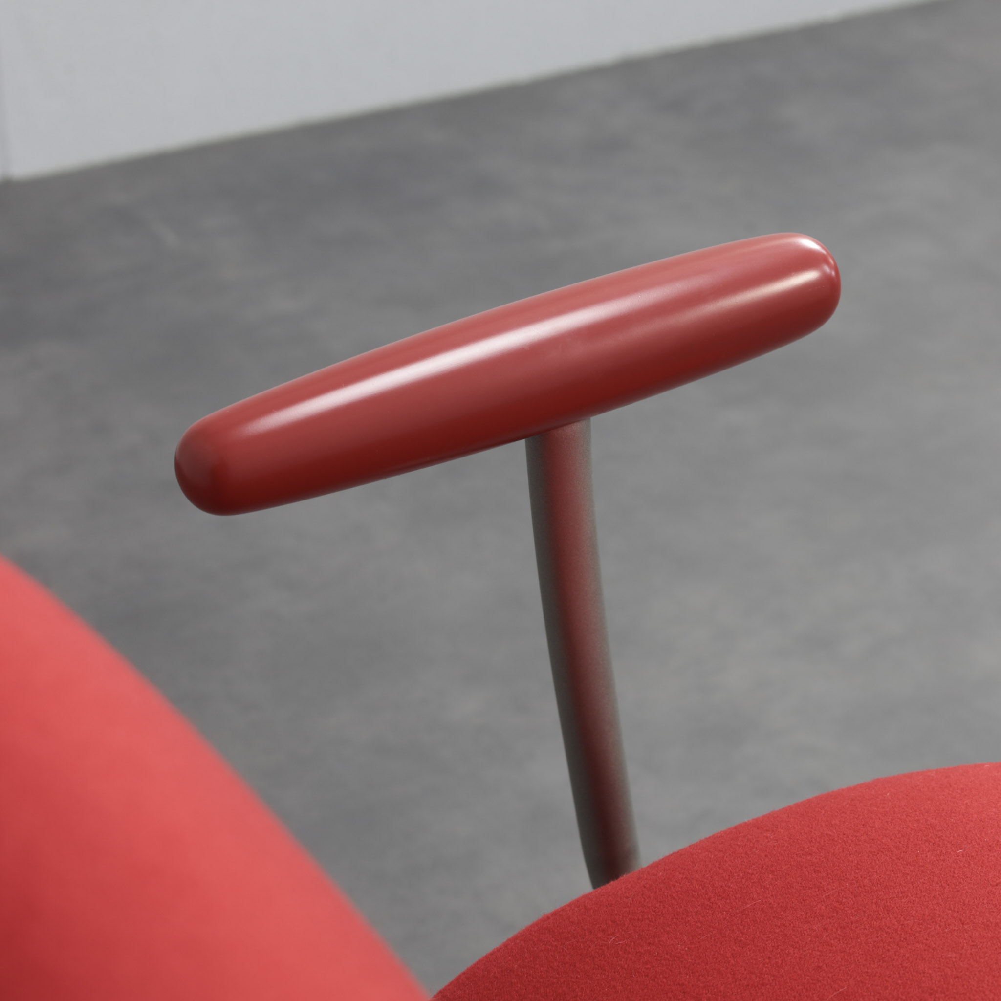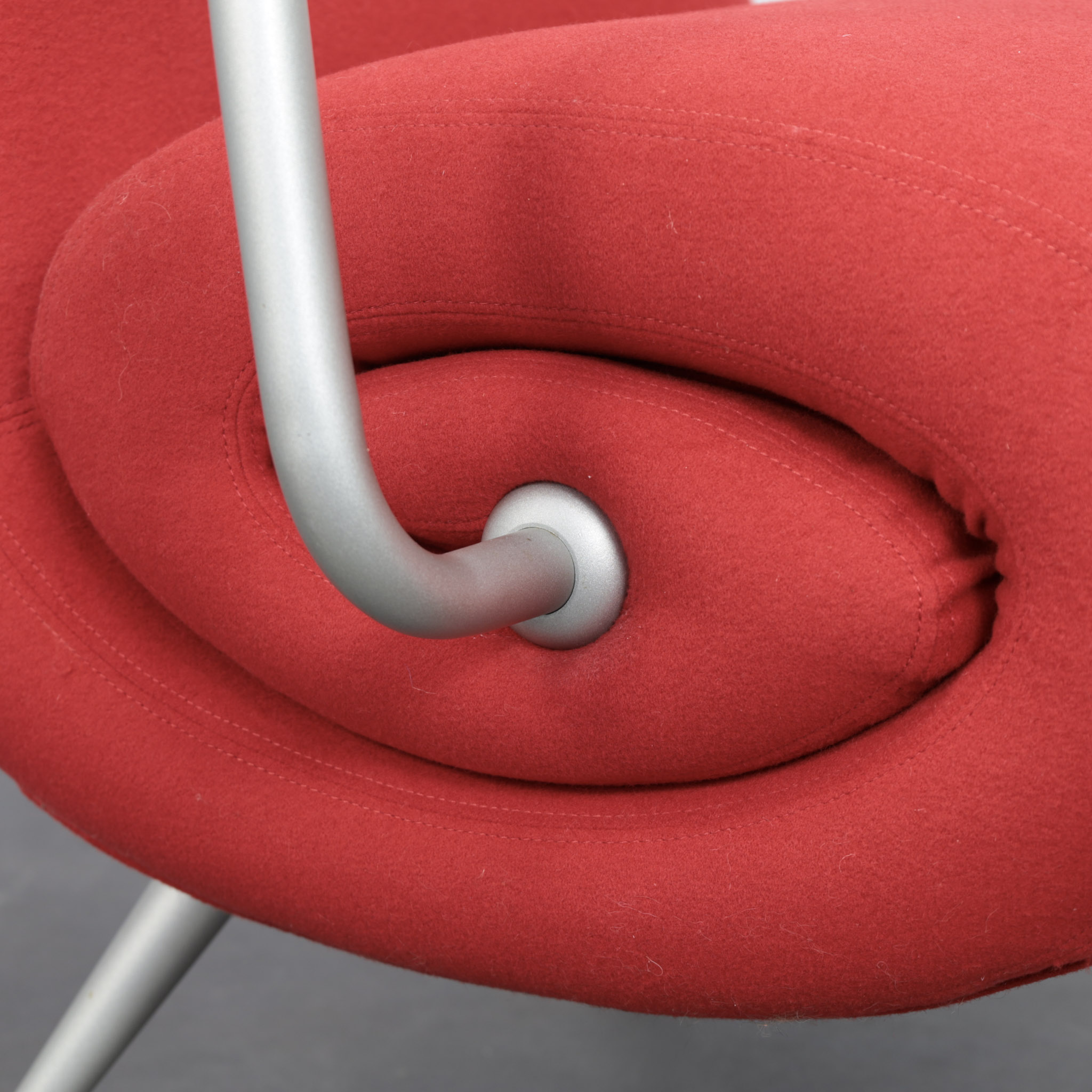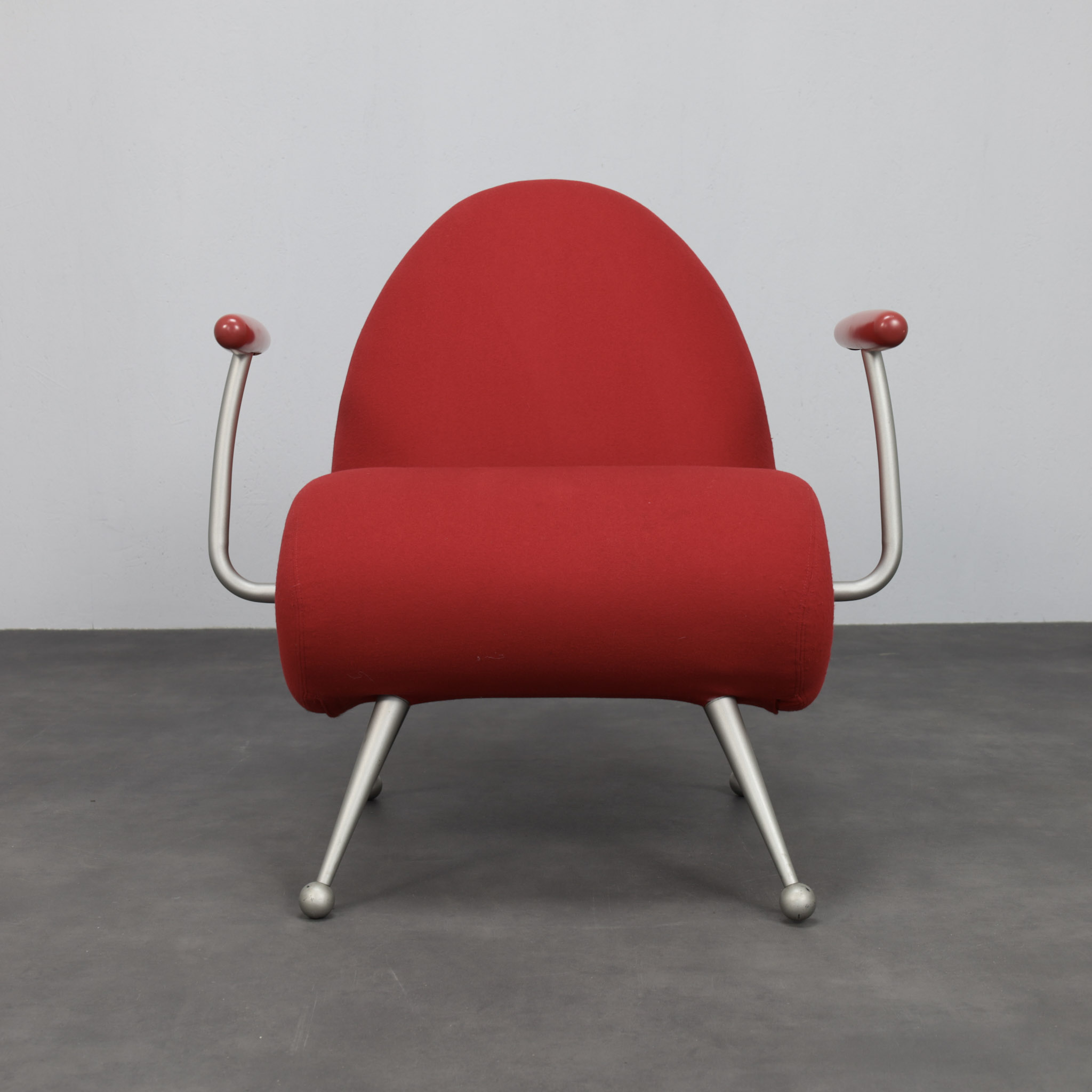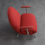 The chair is defined by a continuous silhouette. The curved back flows seamlessly into the generous seat, while the rolled side element forms a soft spiral volume that gives the piece its unmistakable identity. Slender metal legs with spherical feet introduce contrast and visual lightness, balancing the compact upholstered body. The armrests, finished in matching tone, reinforce the graphic precision of the design.