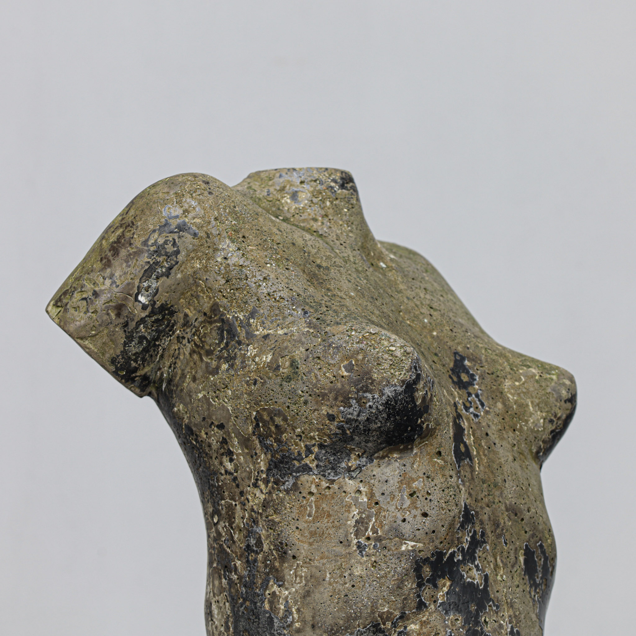 The fragmented torso emphasizes mass, surface, and tactility rather than anatomical detail. Natural variations in tone and texture give the sculpture a geological quality, while the beautifully developed patina adds depth and visual tension. The absence of head and limbs shifts the focus inward, turning the body into a quiet, grounded presence.