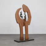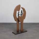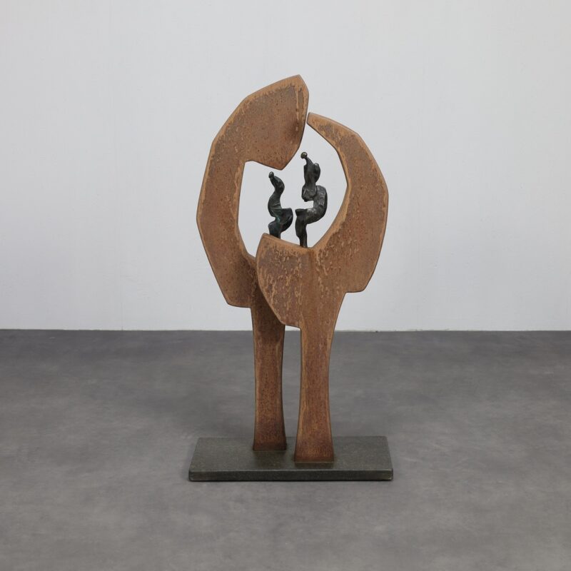 A striking and one-of-a-kind composition, uniting raw corten steel with delicate bronze figures and a solid stone base. The sculpture evokes both strength and intimacy: the weathered steel forms an embracing structure, while the bronze figures within tell a story of human connection. Its patina enriches the depth of the materials, making this an evocative statement piece for indoors or outdoors.