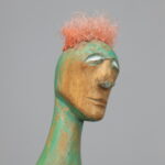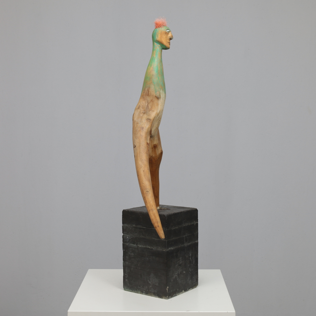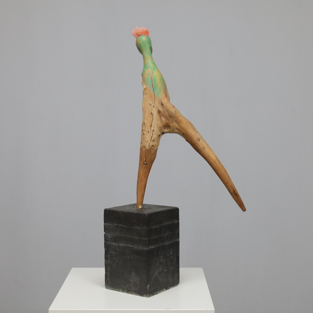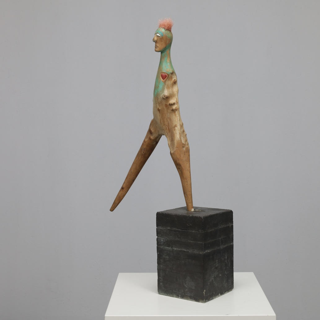 Balancing on a solid geometric base, the sculpture has an almost weightless posture, as if caught between movement and stillness. The carved head, soft facial expression and heart-shaped accent inject a disarming humanity, whereas the found-wood body preserves the organic history of the land it came from. It is a rare example of de Munk-Kerkmeer’s ability to merge nature, storytelling and contemporary sculpture.