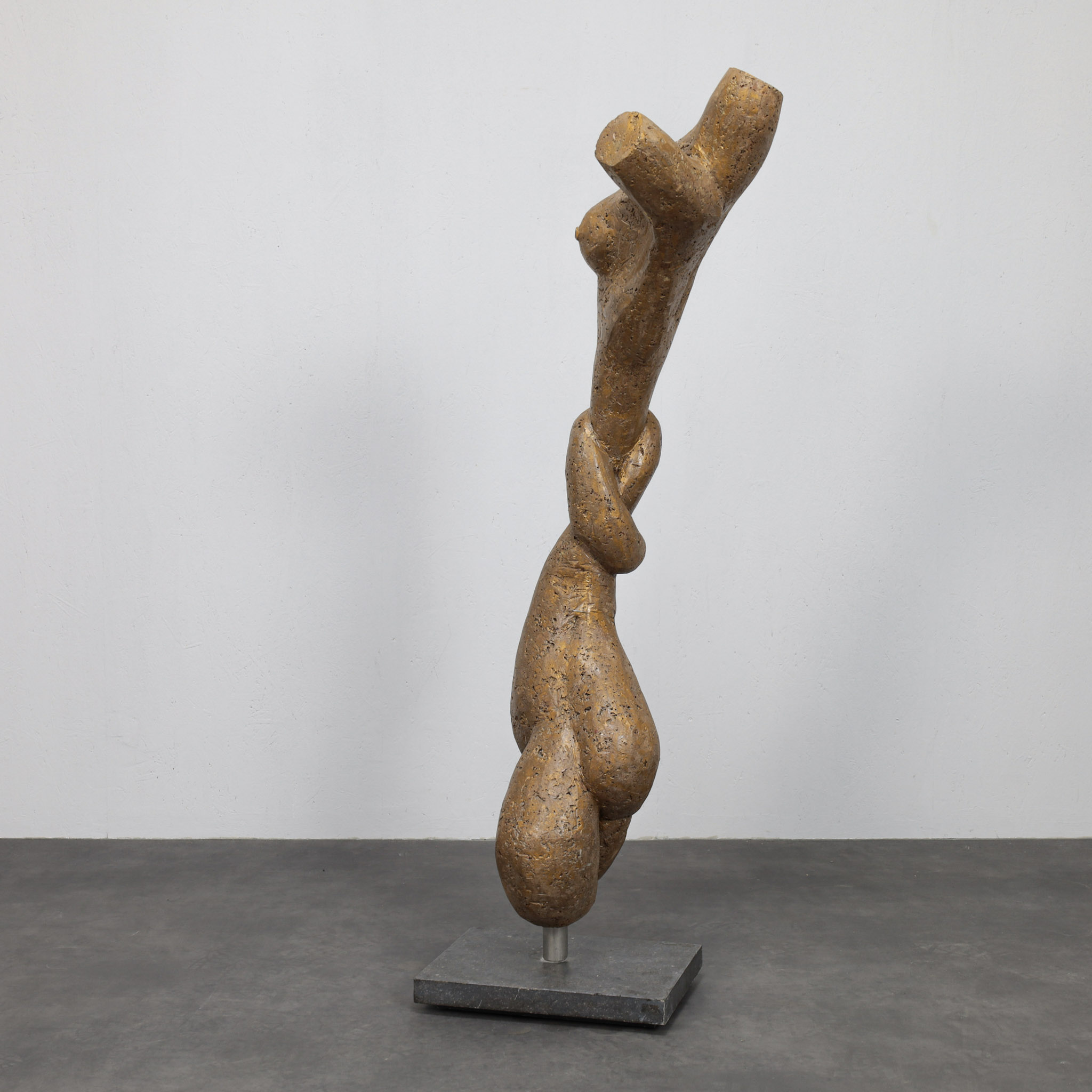 The sculptural body twists around itself, creating a knot-like articulation at its centre. Above, the form opens outward in a subtle, upward extension, suggesting growth or emancipation. The surface carries a granular, almost mineral quality, the bronze powder catching light while the underlying structure retains the organic density of compressed wood fibres.
