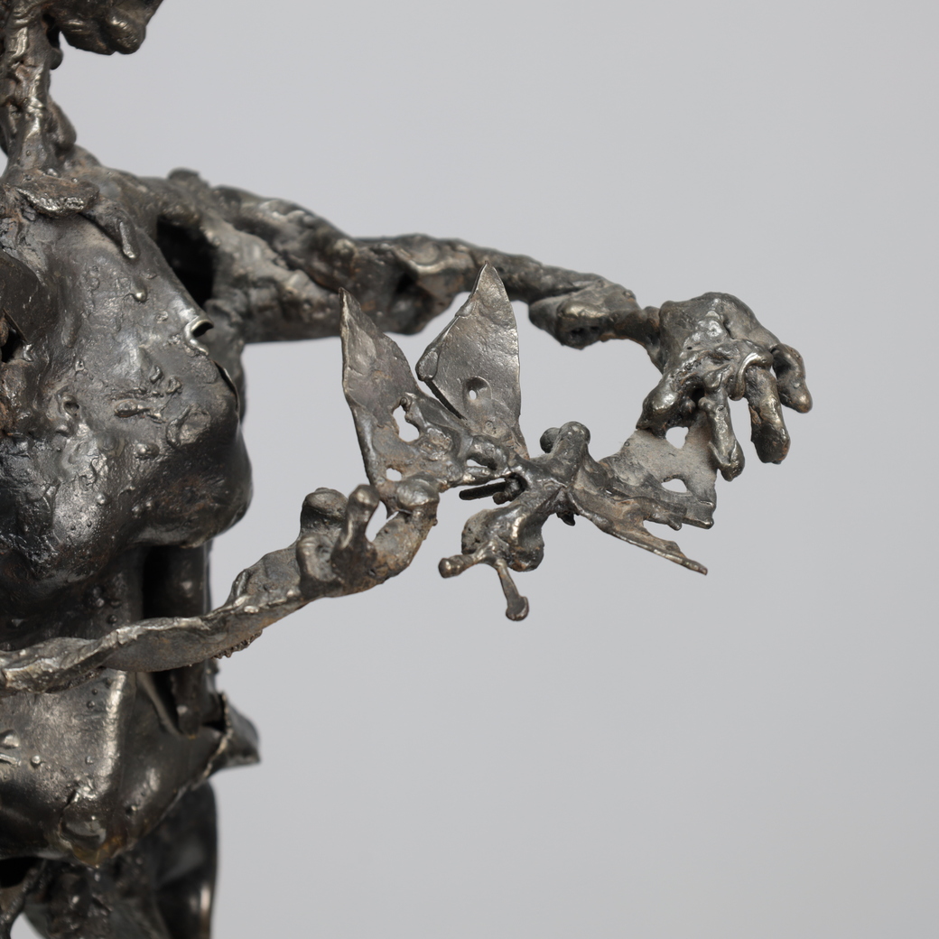 Caught between motion and stillness, the figure seems to hover in a state of introspection. Binstead masterfully transforms industrial material into something profoundly poetic, giving iron a human pulse.