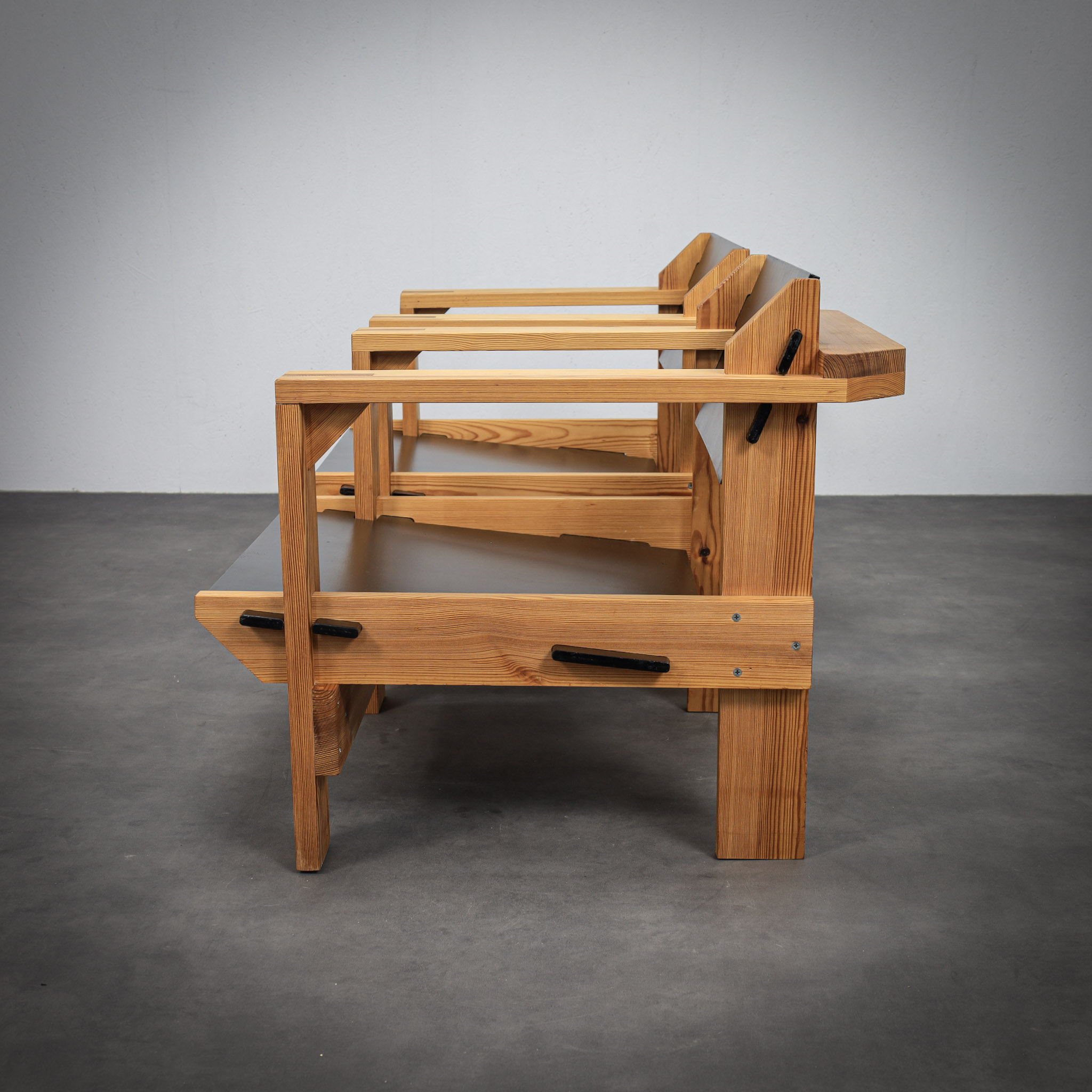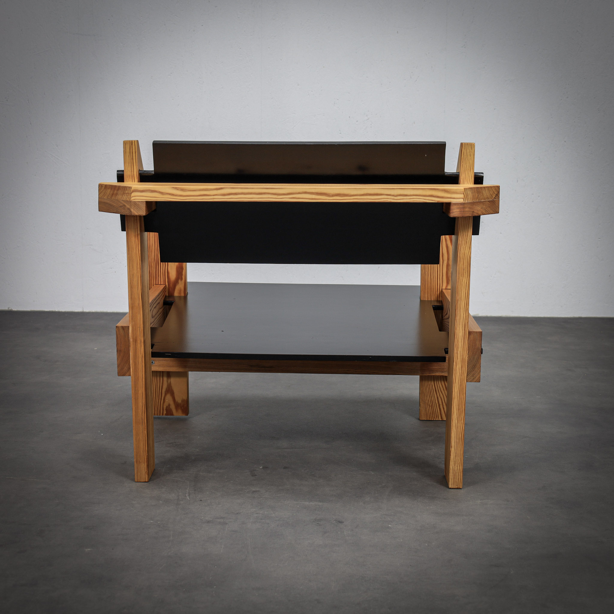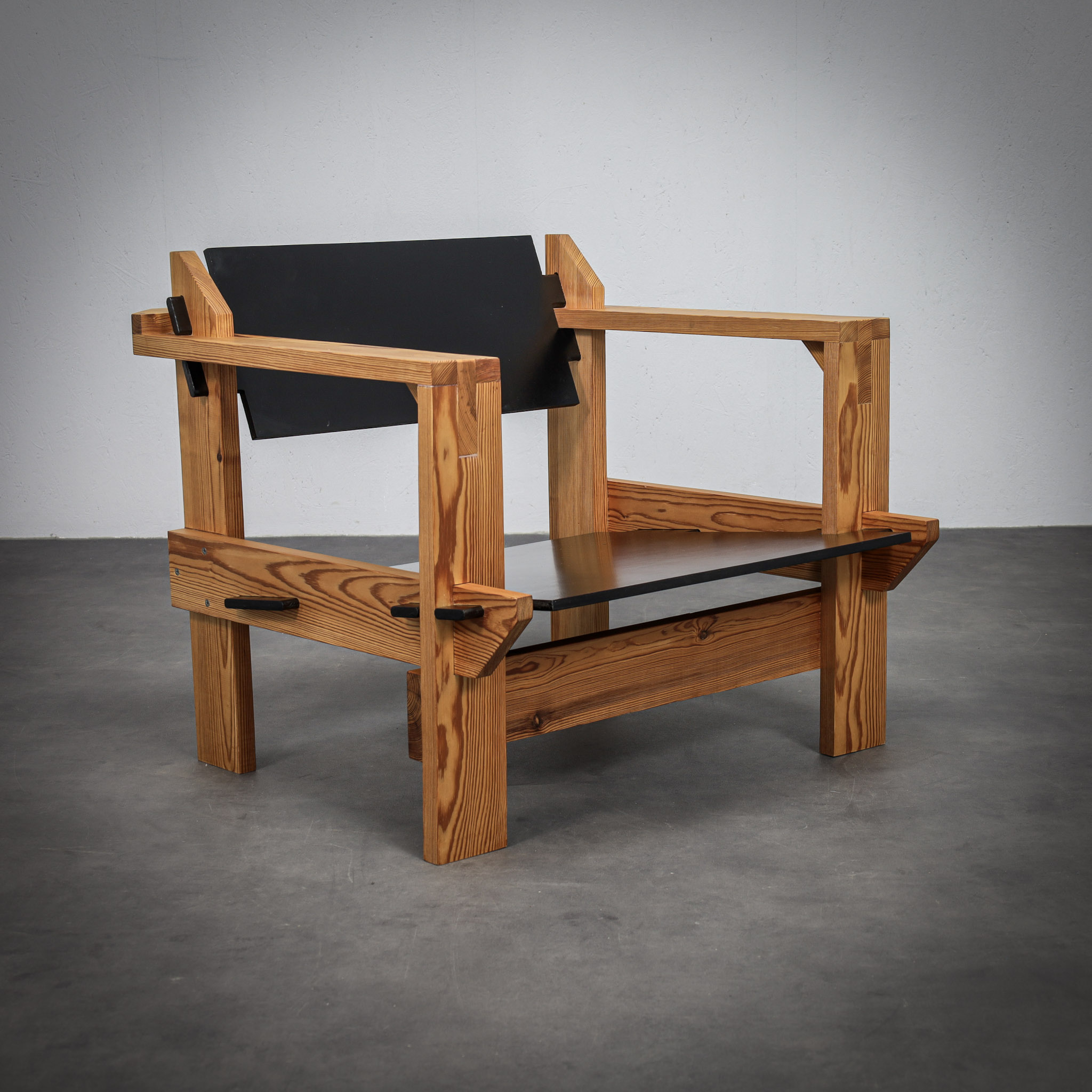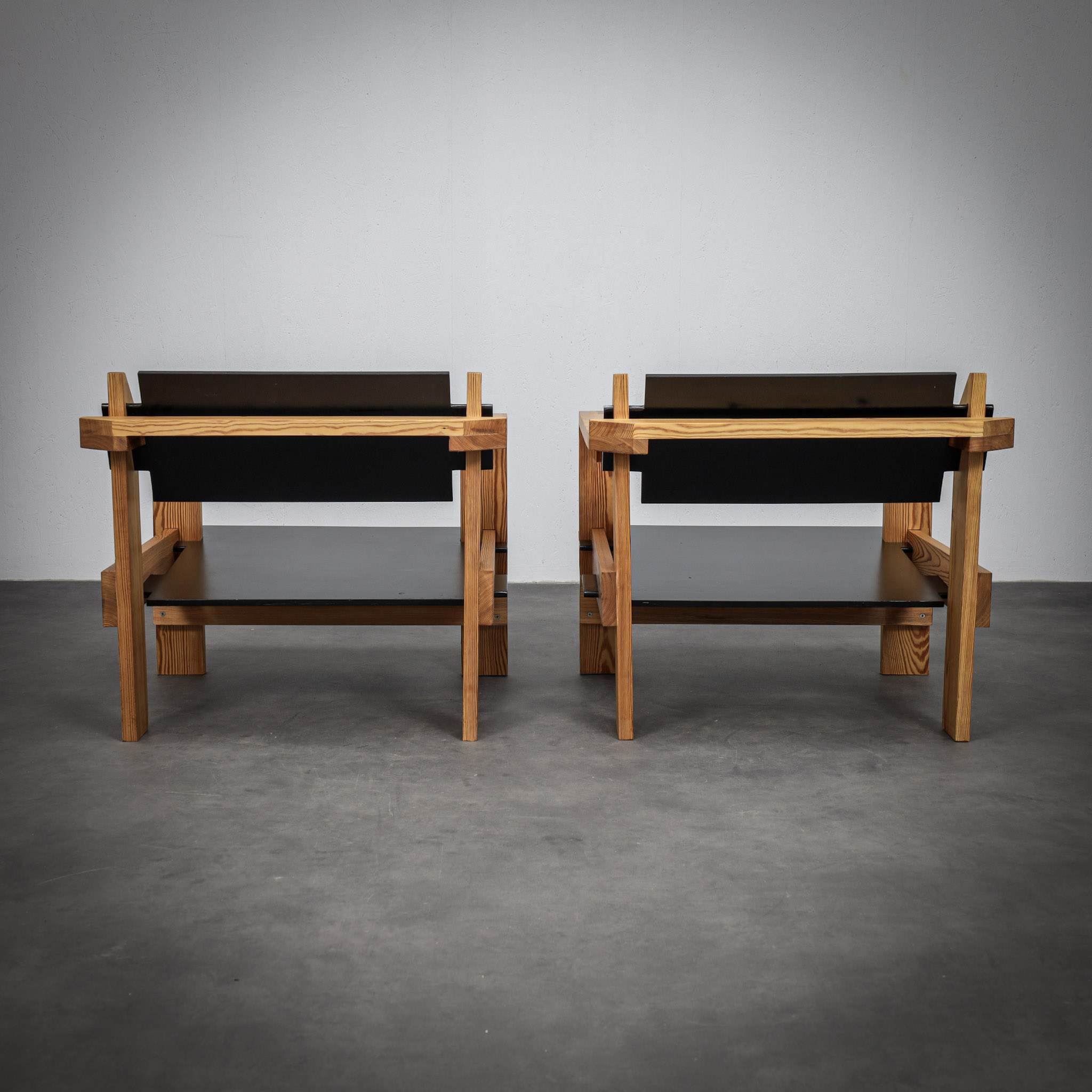 Crafted from solid pine with a pronounced and expressive grain, the chairs possess a strong architectural presence. The design is defined by its bold, rectilinear construction, contrasted by dark planar seat and back elements that introduce depth and visual tension. The exposed joinery and structural clarity place these chairs within the lineage of Dutch modernism with clear brutalist undertones.