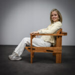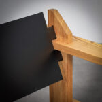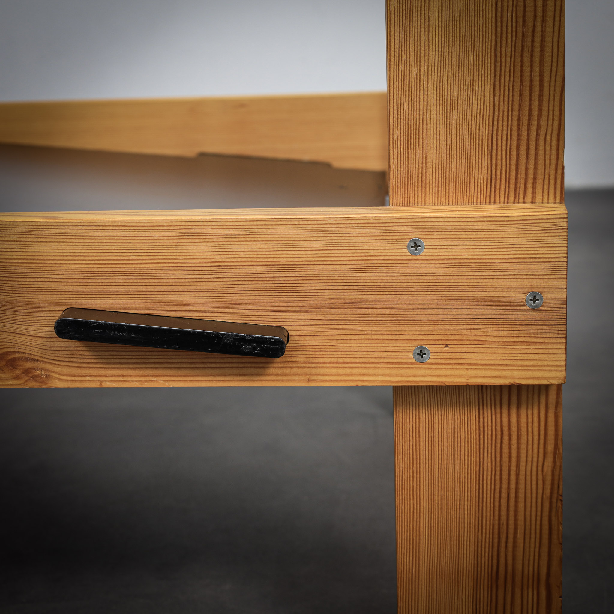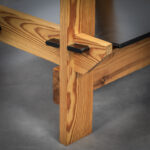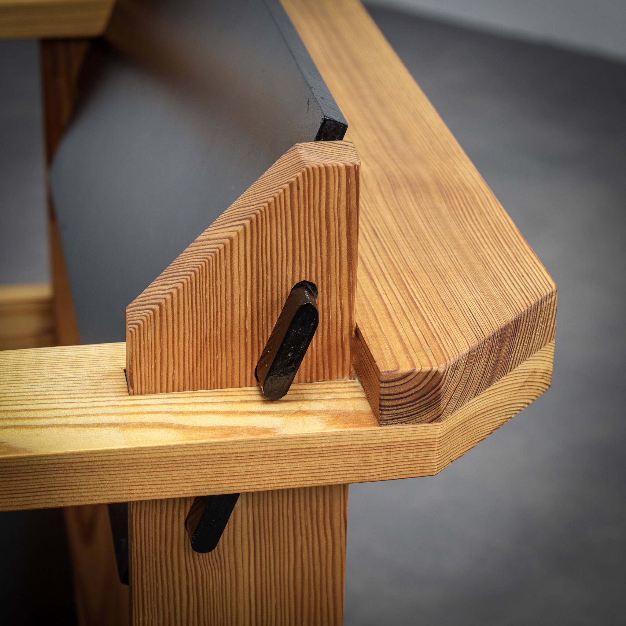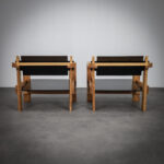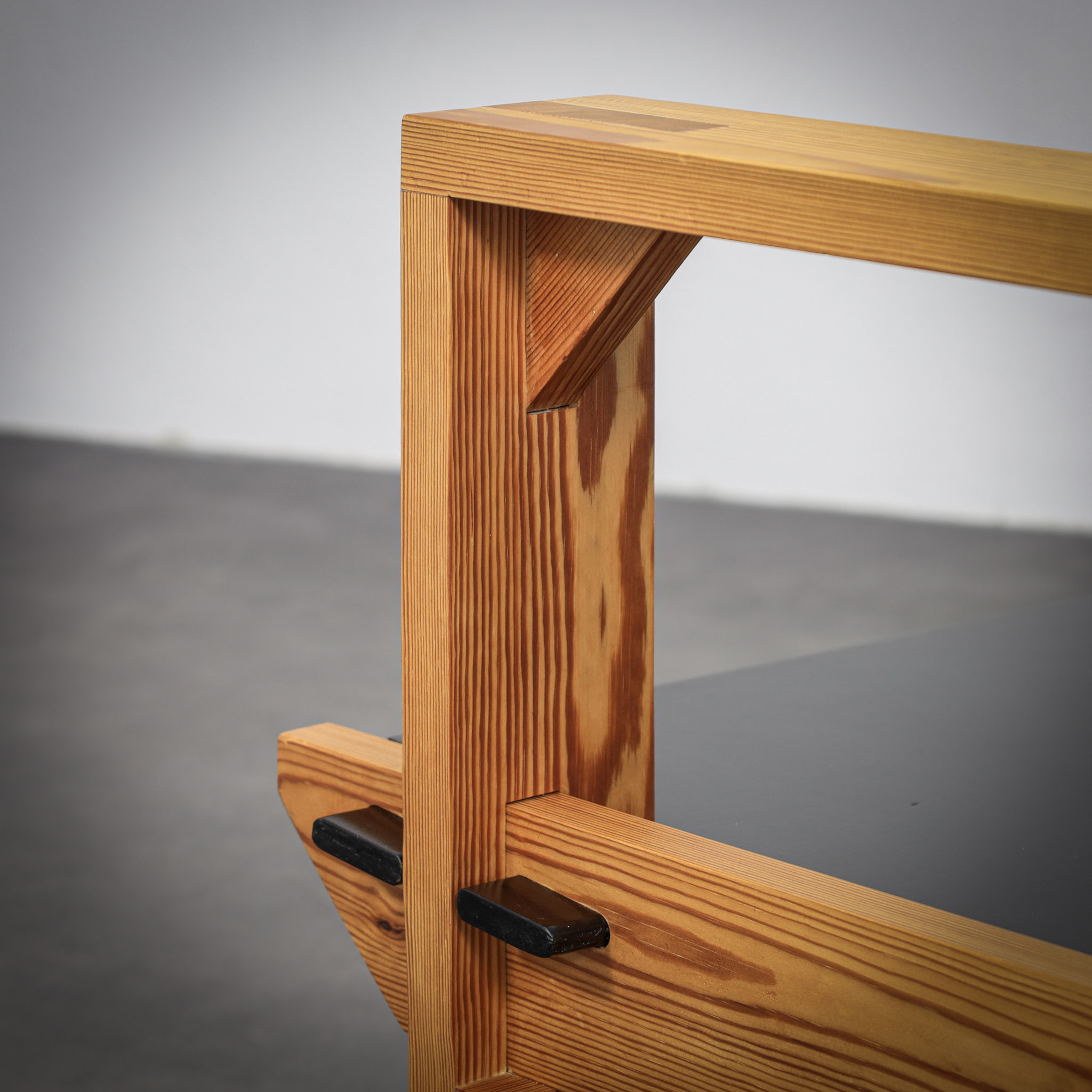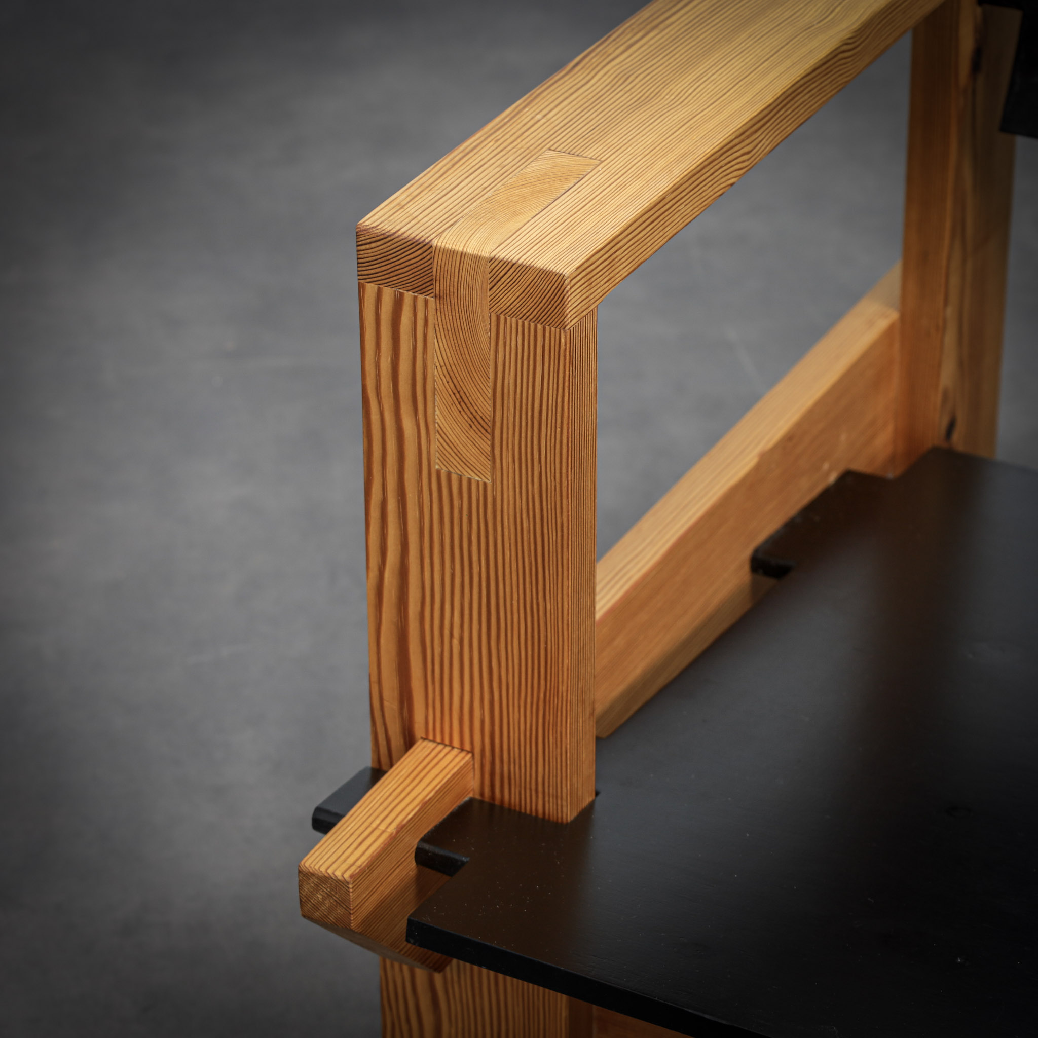 Crafted from solid pine with a pronounced and expressive grain, the chairs possess a strong architectural presence. The design is defined by its bold, rectilinear construction, contrasted by dark planar seat and back elements that introduce depth and visual tension. The exposed joinery and structural clarity place these chairs within the lineage of Dutch modernism with clear brutalist undertones.