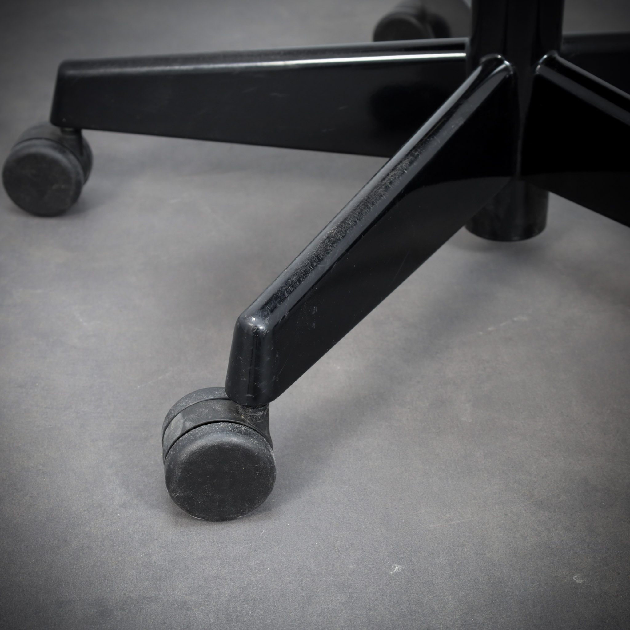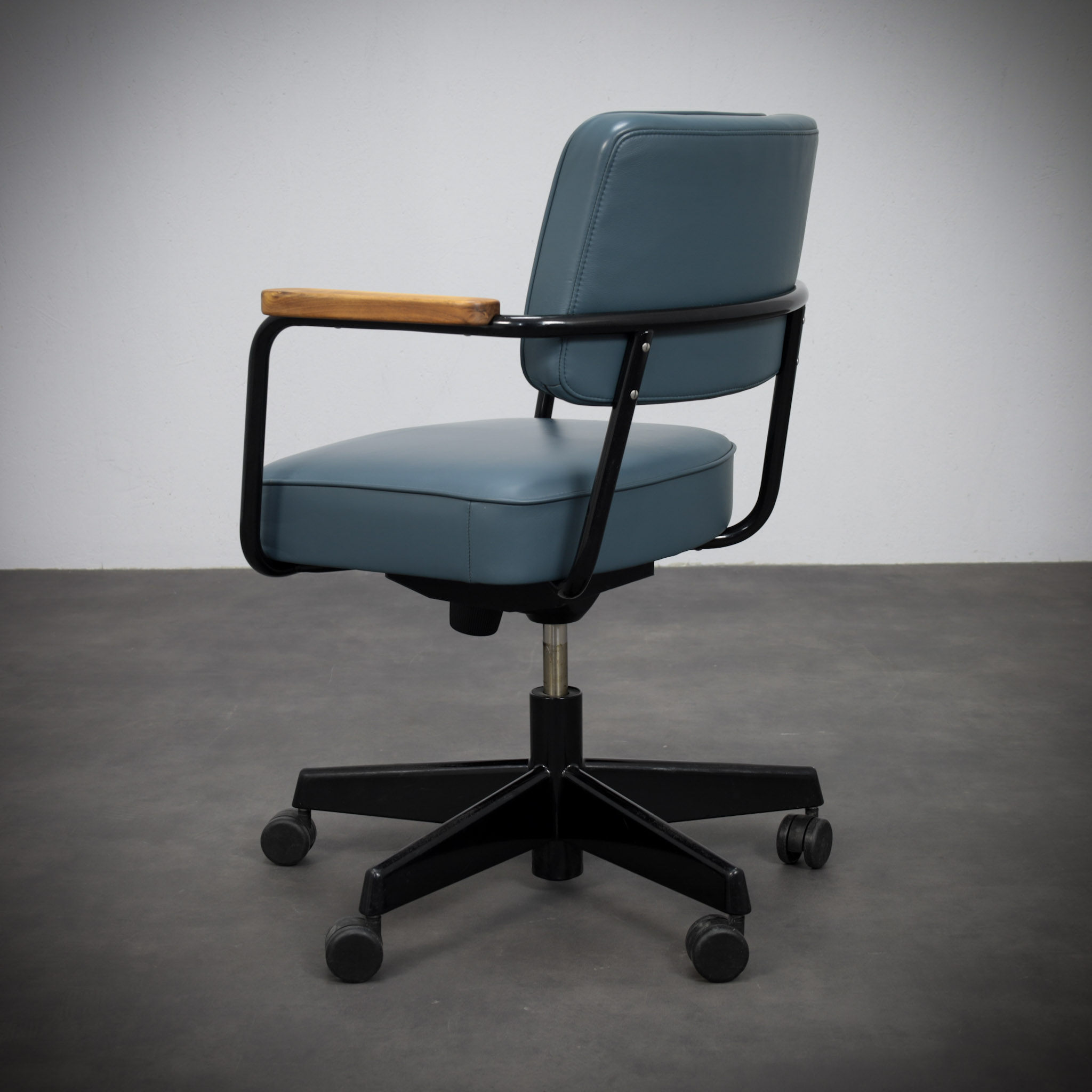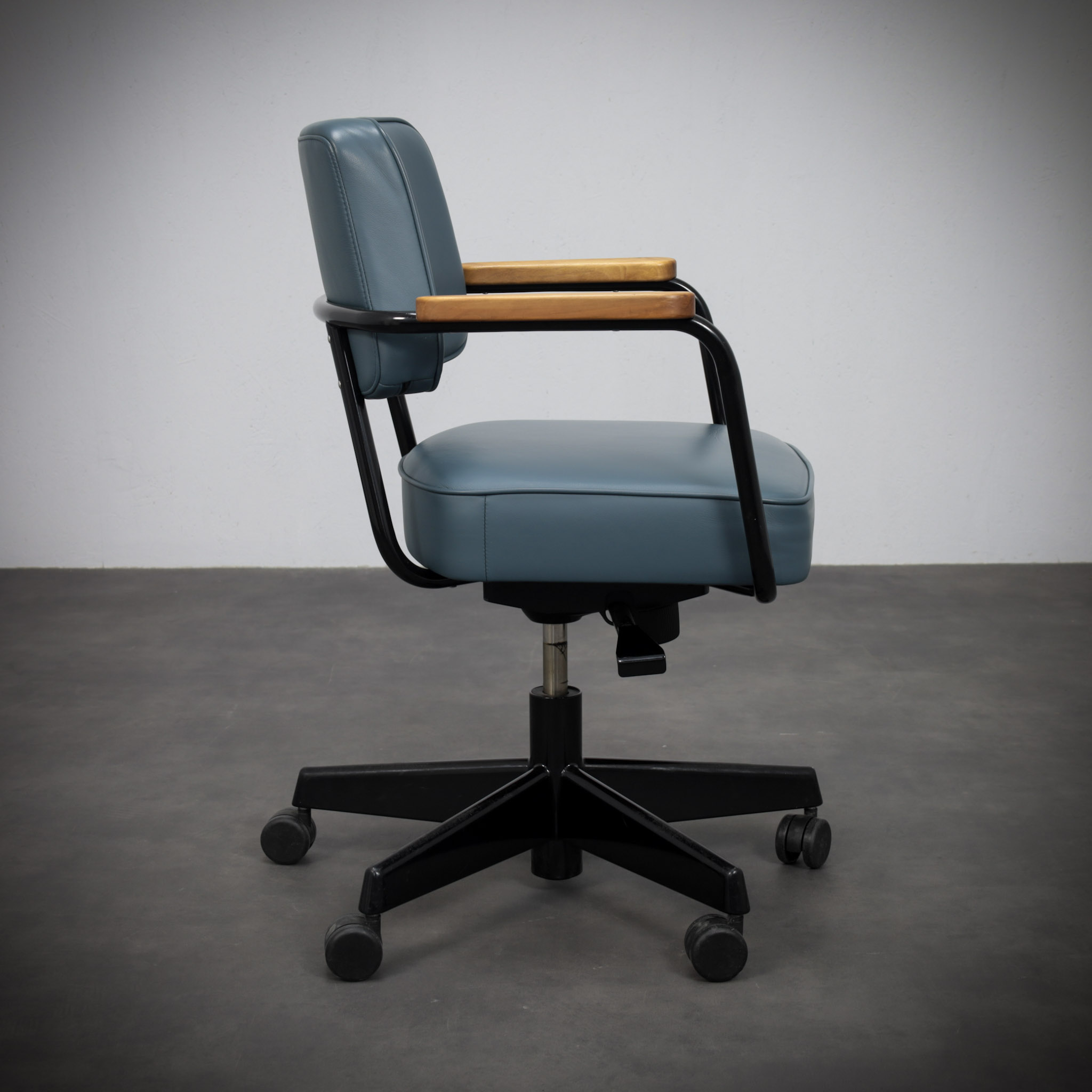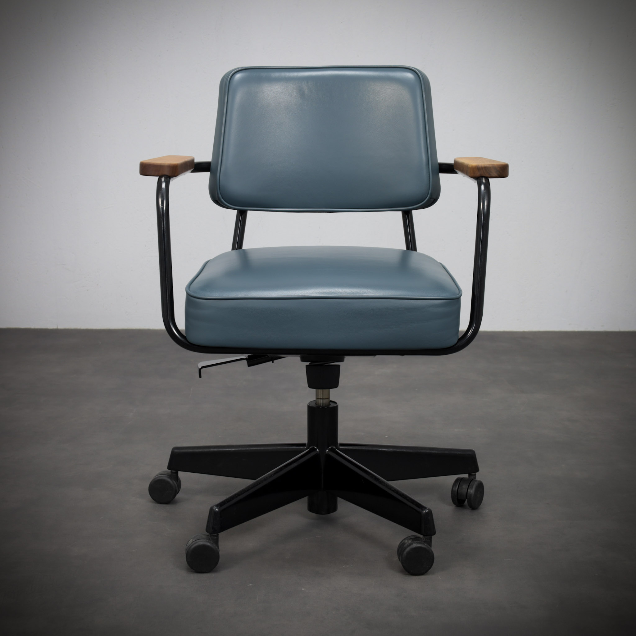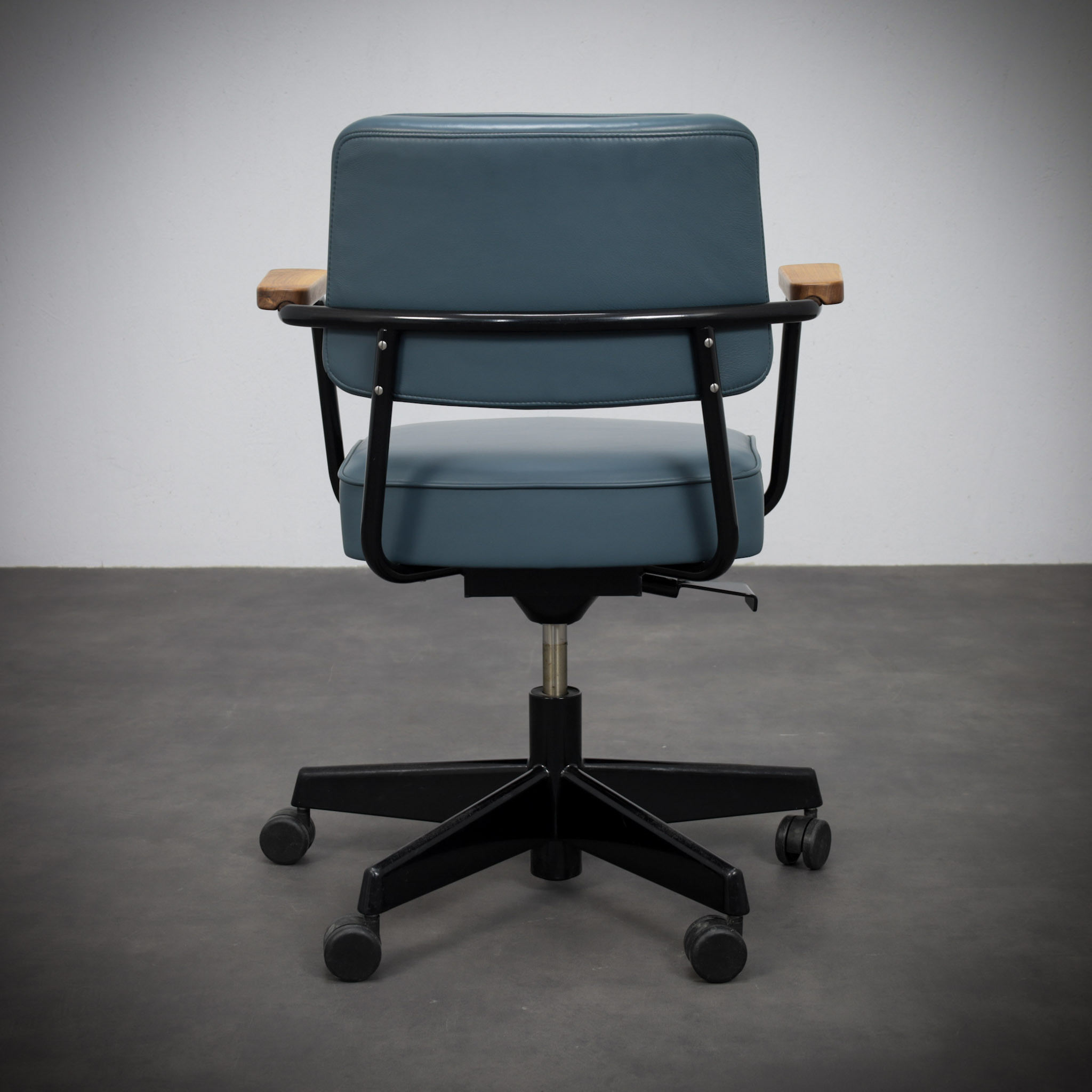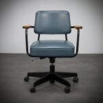 Mounted on a pivoting office base with castors, the chair translates Prouvé’s structural thinking into a functional workspace object. Every element appears purposeful, with the curved metal supports acting simultaneously as structure and visual line.