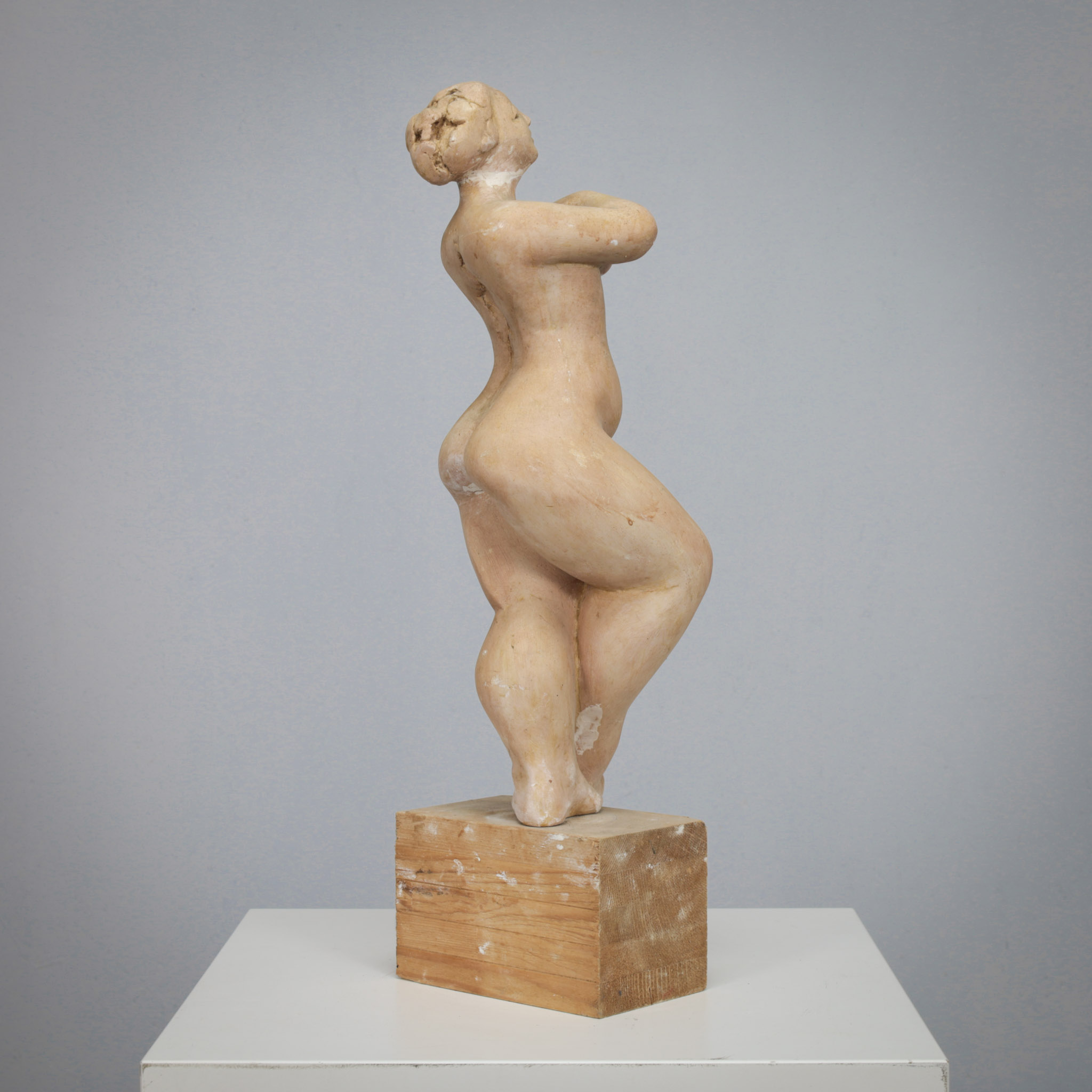 This evocative group of four female sculptures by Francine Govers, created in the Netherlands during the 1990s, presents an intimate study of the female body through variation, posture, and presence. Executed in a clay-based material and placed on wooden bases, each figure stands as an individual expression while forming a quiet, cohesive ensemble.