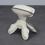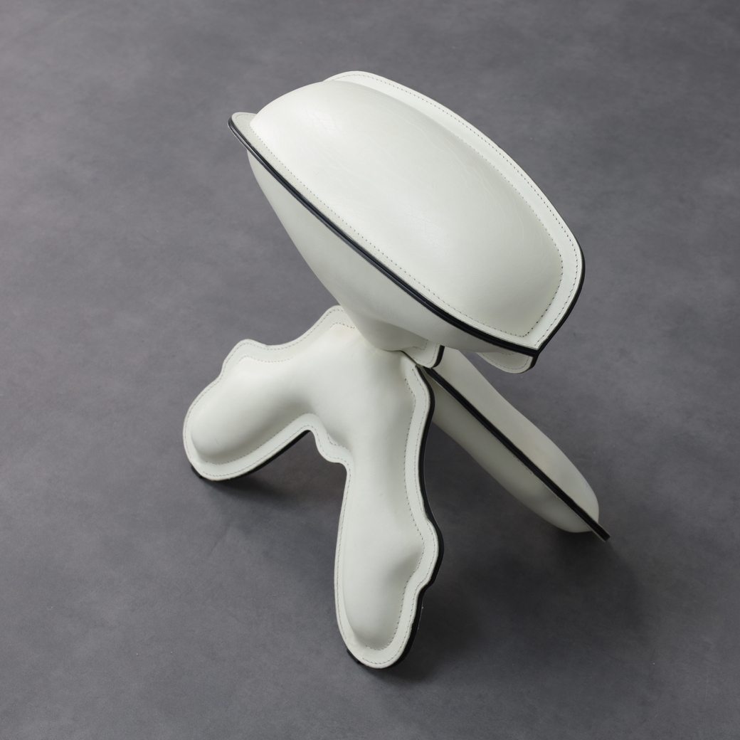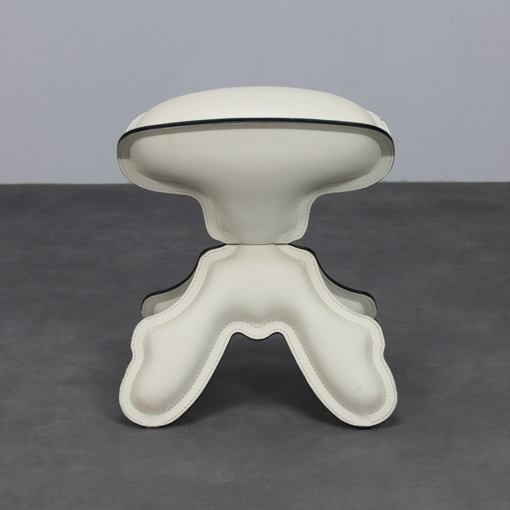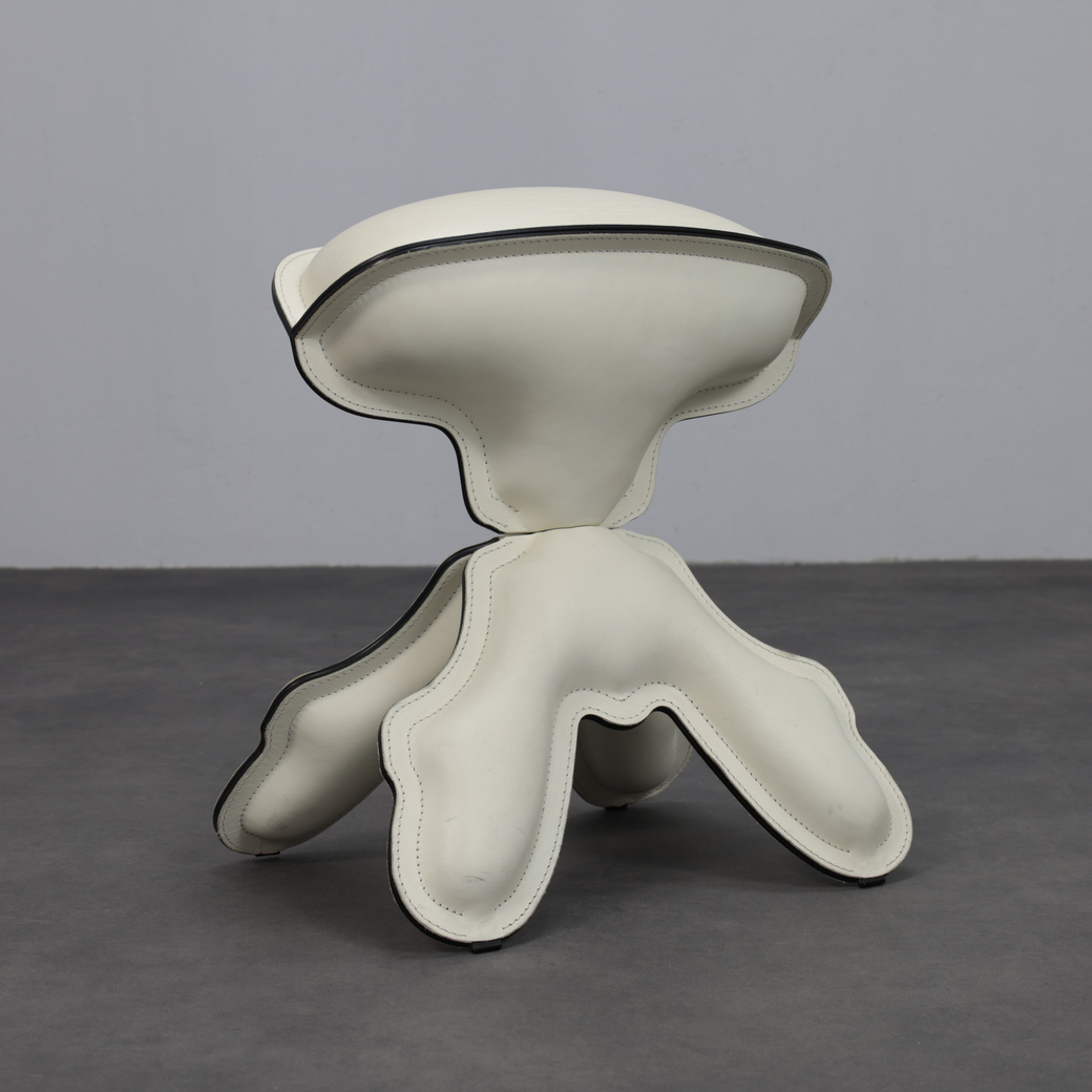 The stool’s organic, almost creature-like silhouette is immediately recognizable. Upholstered in supple leather with pronounced stitched contours, the form reads as both soft and architectural. The flowing, hand-like base supports a gently domed seat, creating a visual tension between stability and playfulness. Black piping accentuates the outlines, emphasizing the graphic quality of the design and its carefully considered construction.