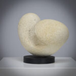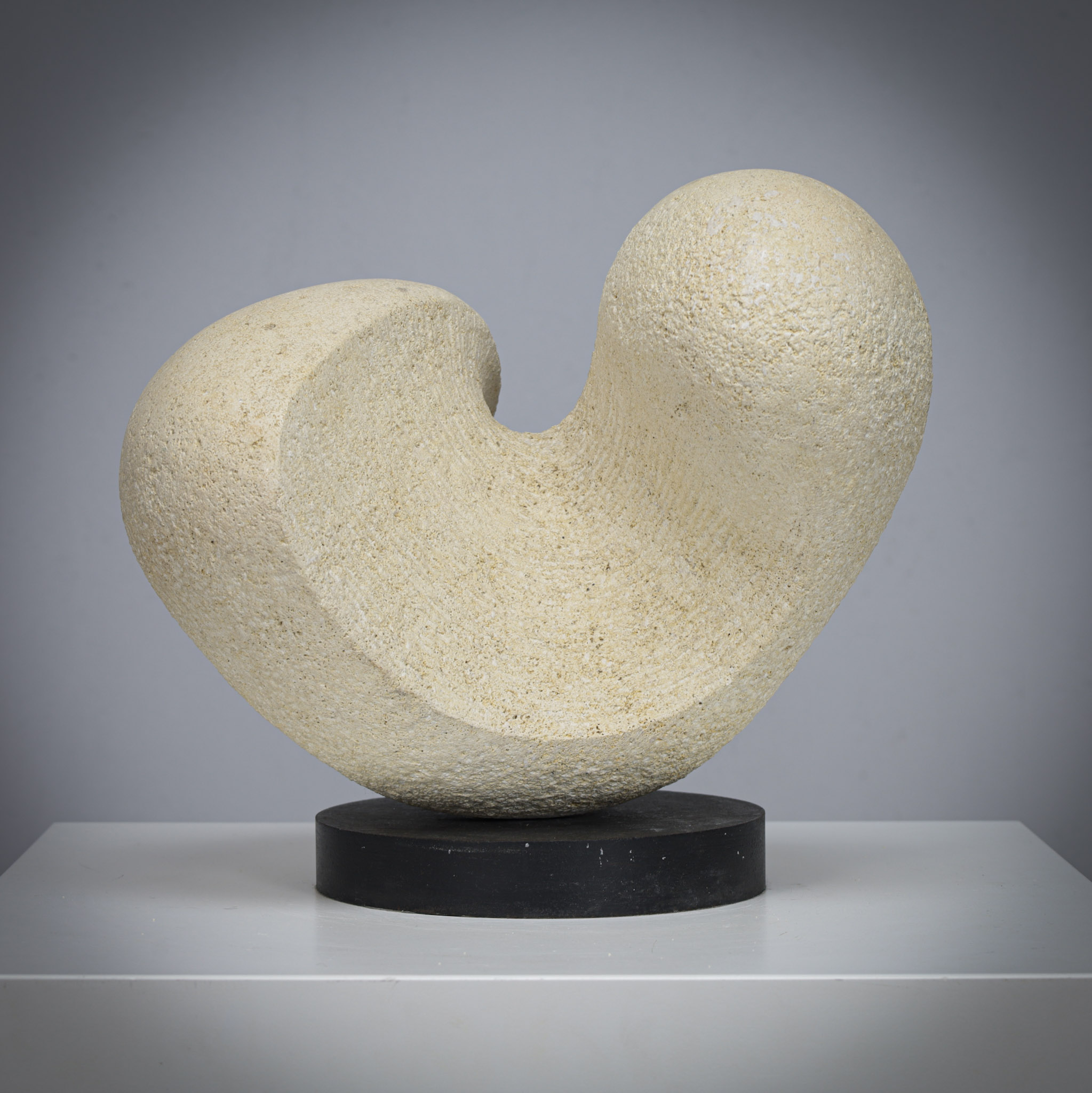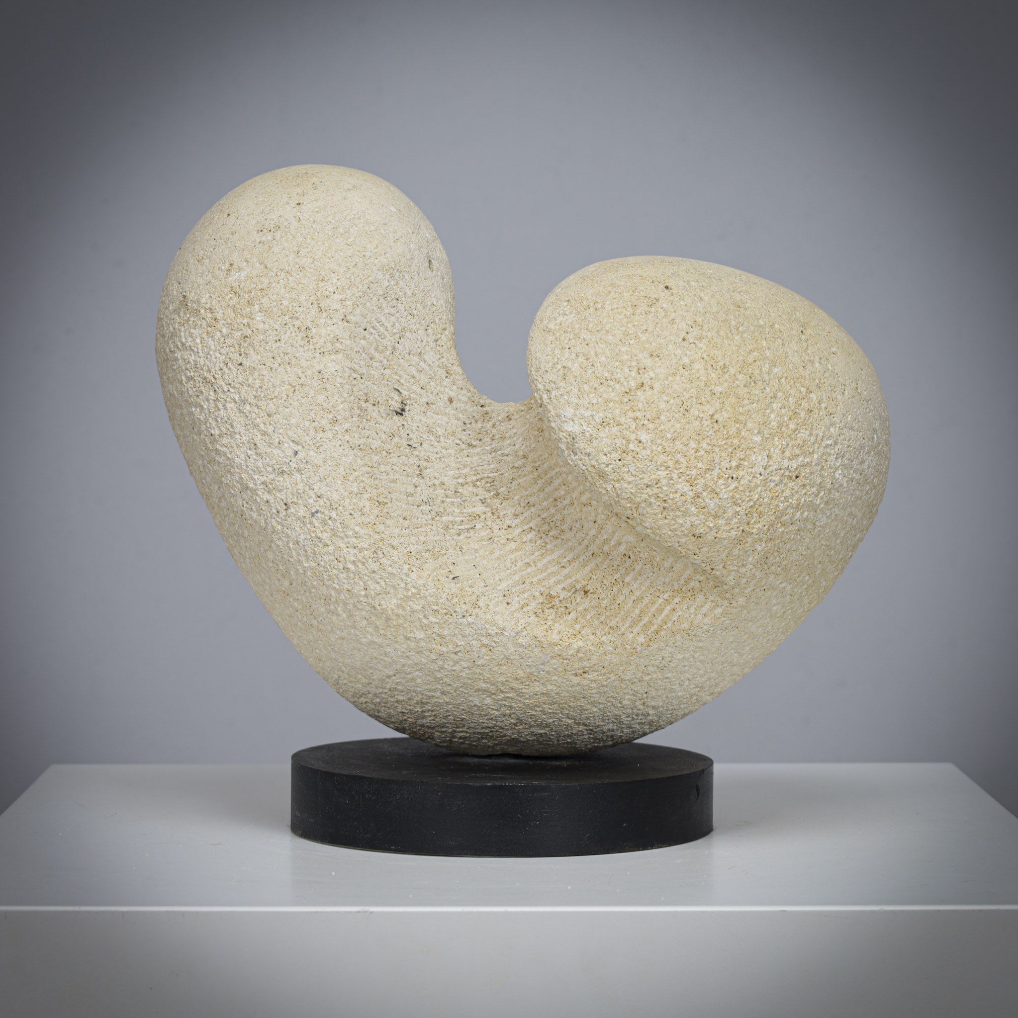 Resting on a black base, the contrast between light stone and dark support emphasizes the sculptural silhouette and elevates the work visually.