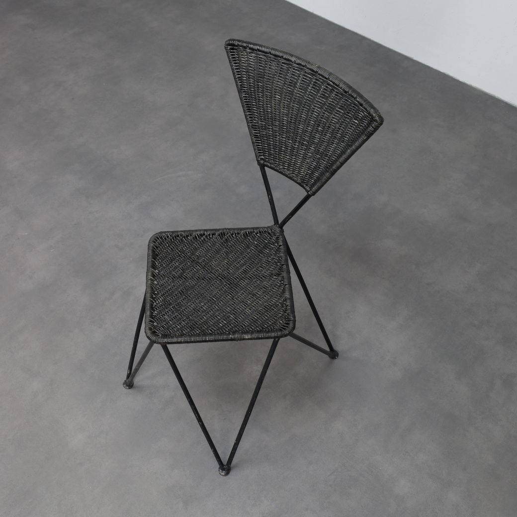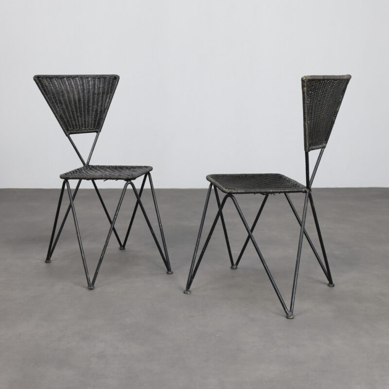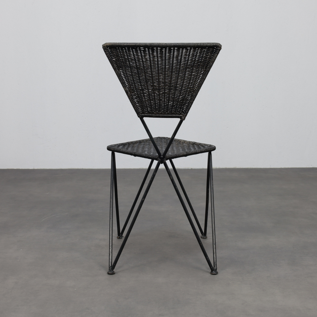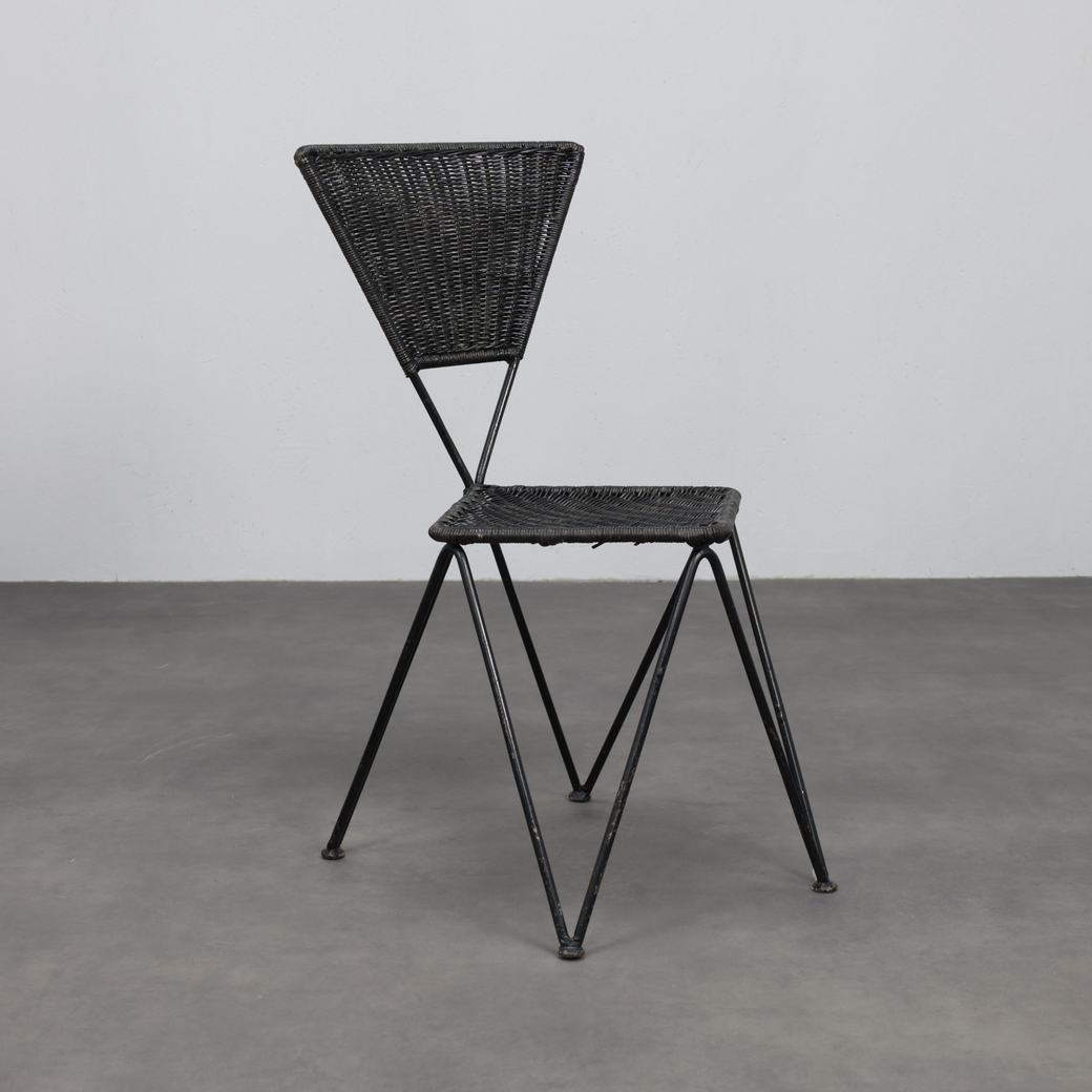 The dynamic, folded-metal frame with its rhythmic triangular supports captures the optimistic postwar spirit of mid-century Europe. The finely woven wicker seats and backs add a tactile, human touch, softening the graphic linearity of the design. Together, they embody both lightness and strength a quiet balance of form and function.