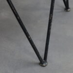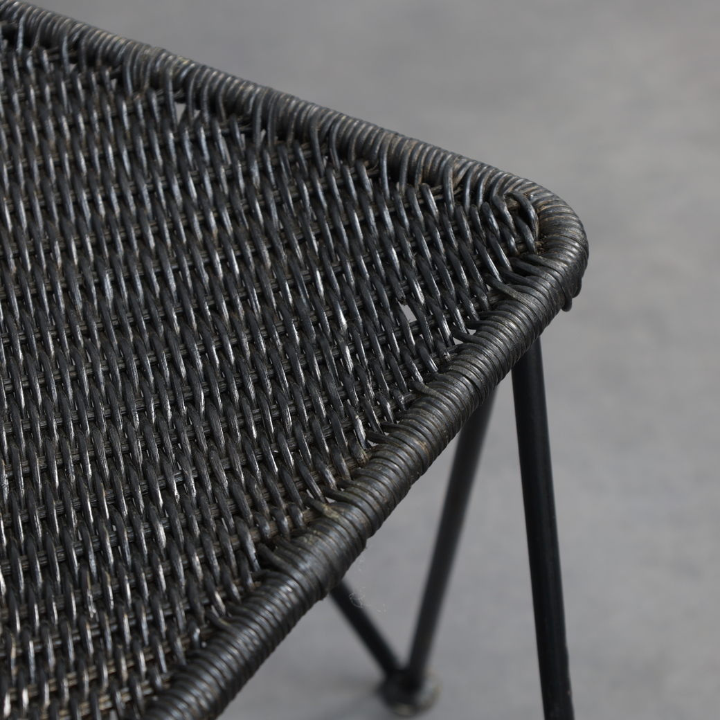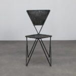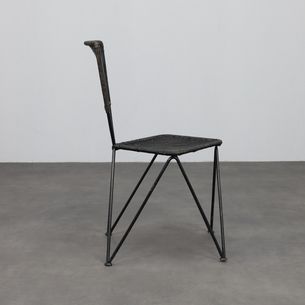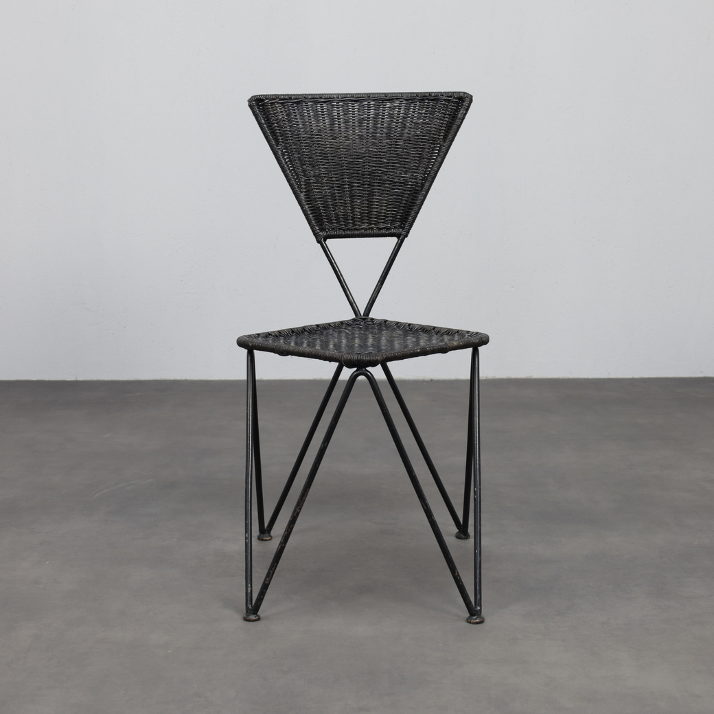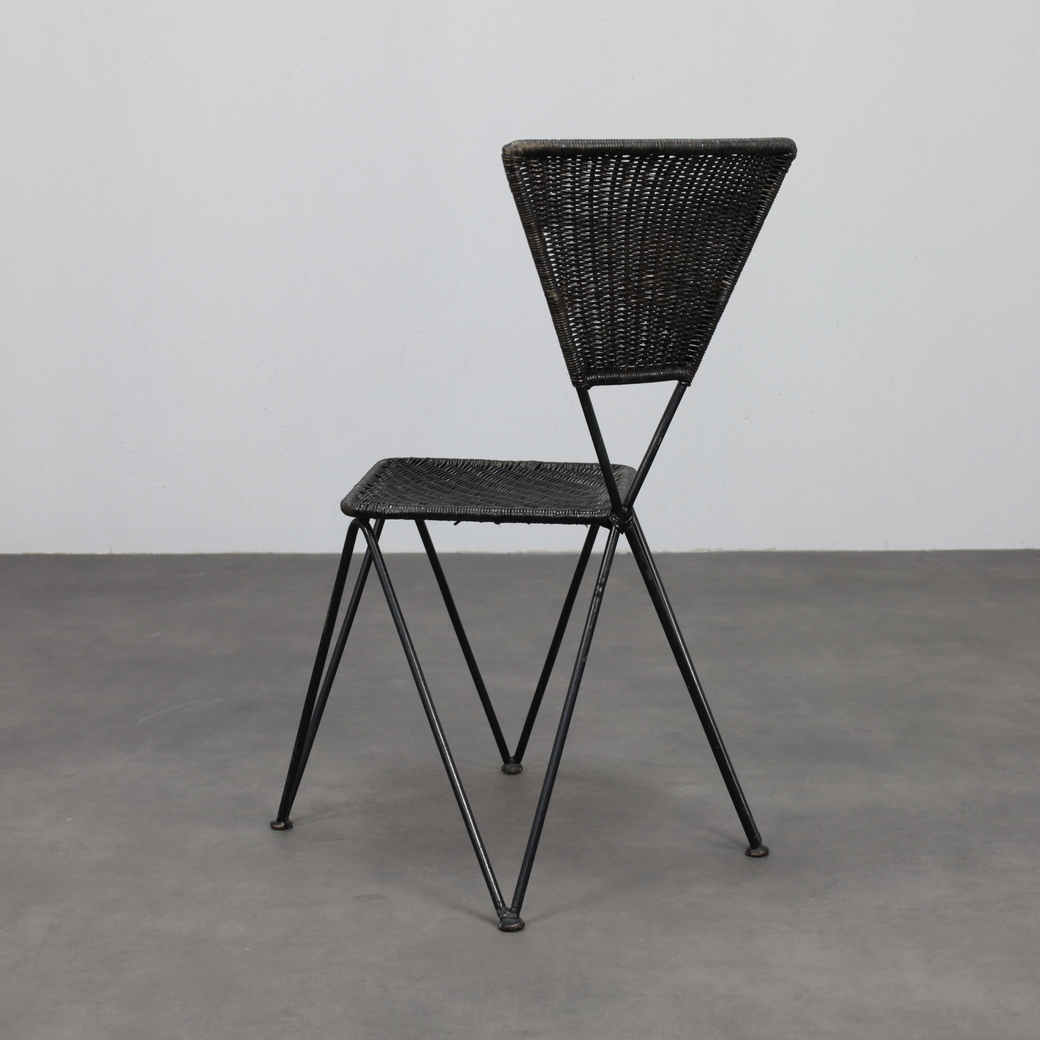 The dynamic, folded-metal frame with its rhythmic triangular supports captures the optimistic postwar spirit of mid-century Europe. The finely woven wicker seats and backs add a tactile, human touch, softening the graphic linearity of the design. Together, they embody both lightness and strength a quiet balance of form and function.