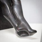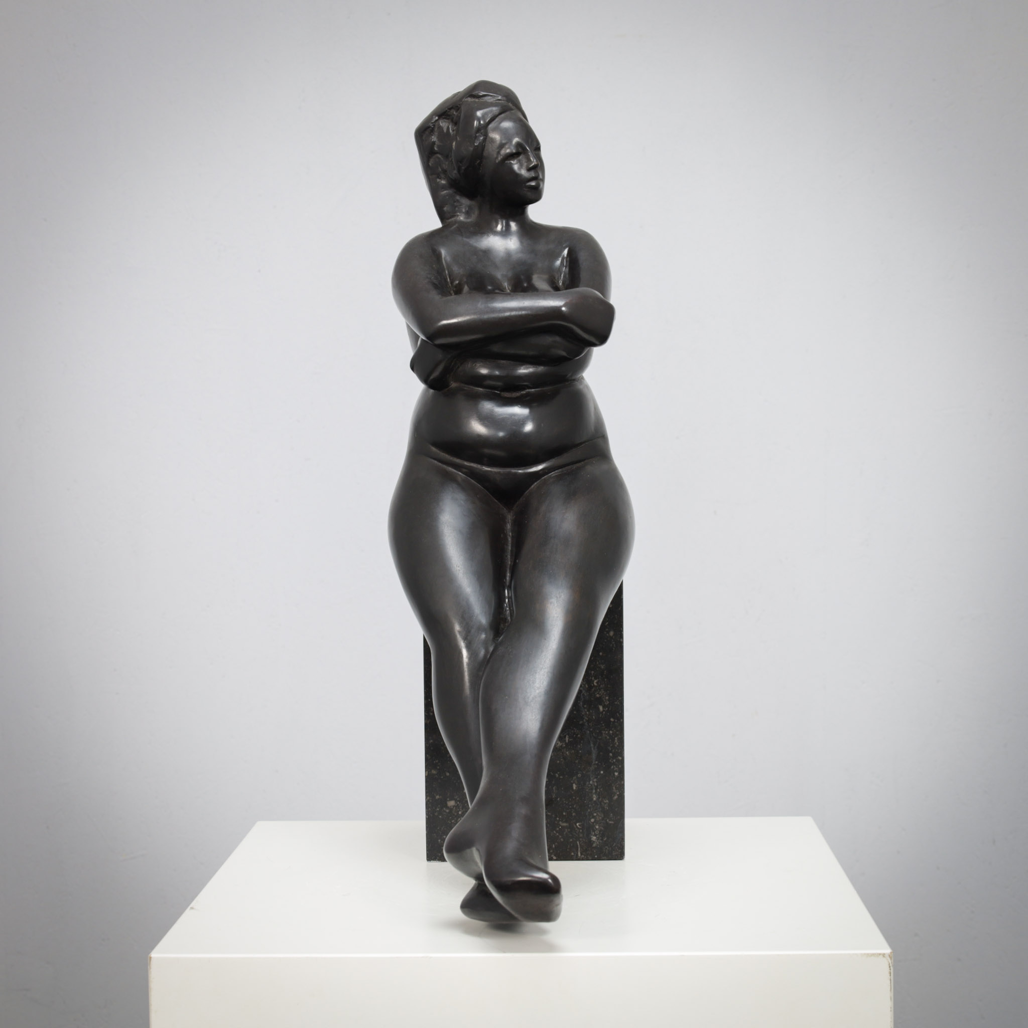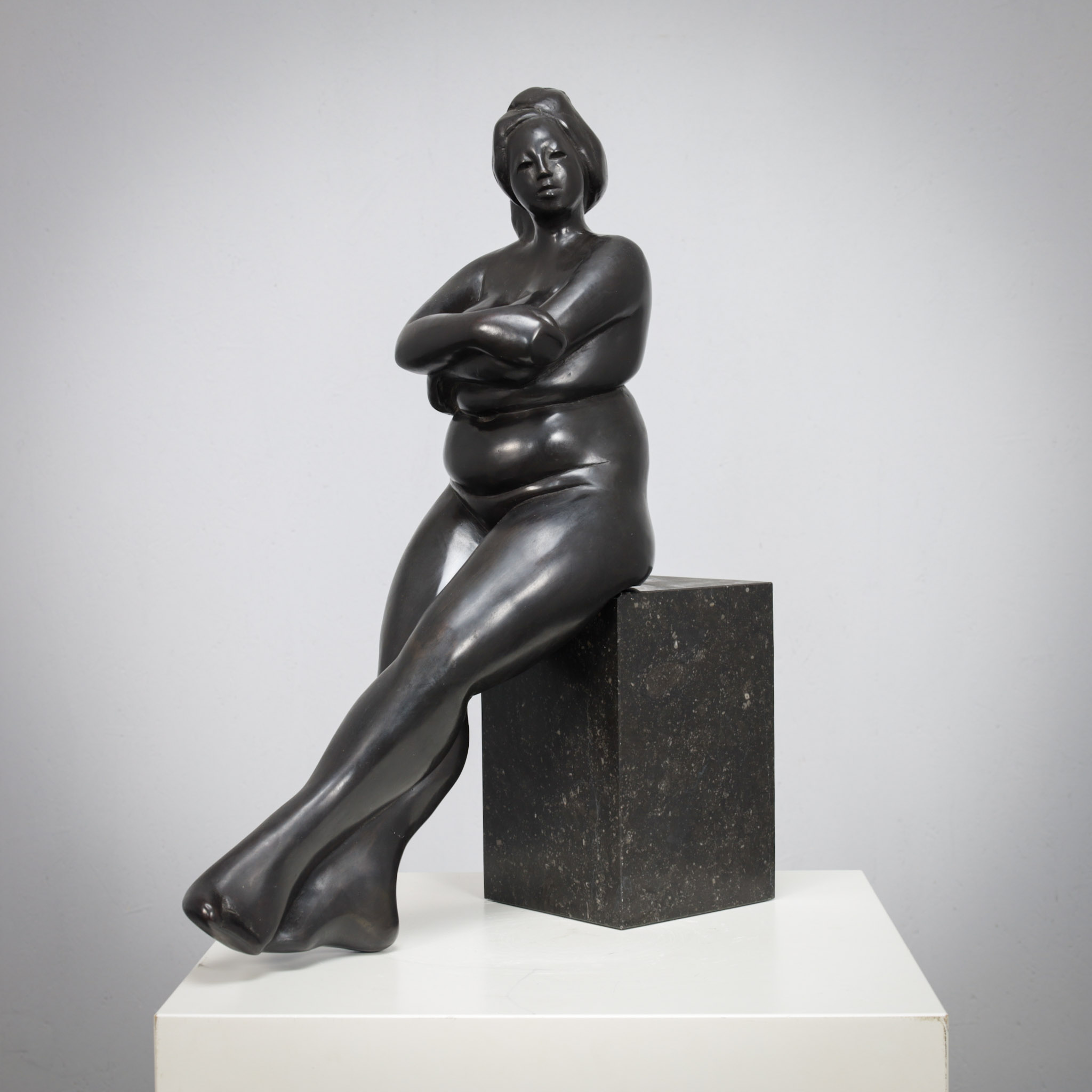 The composition balances naturalistic form with subtle stylization. The crossed arms and relaxed posture convey a quiet introspection, while the elongated legs introduce an elegant sense of line and proportion. The surface of the bronze is smooth and tactile, catching light in a way that enhances the sculpture’s sculptural depth and warmth.