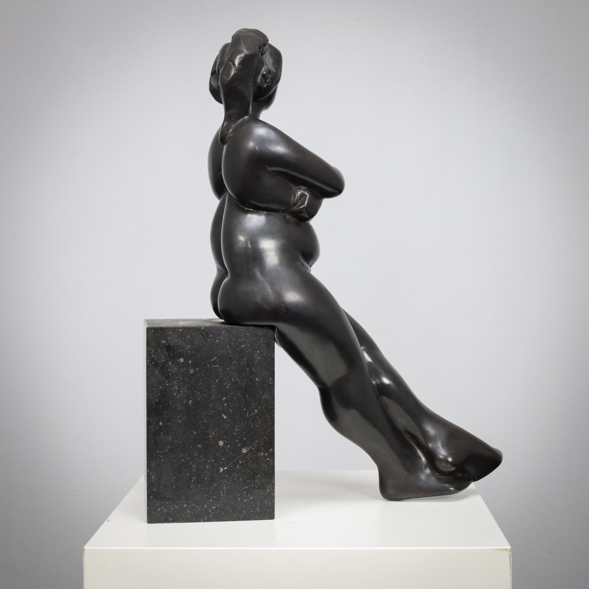 A refined bronze sculpture by Dutch artist Francine Govers, created in the 1990s. The work depicts a seated female figure, rendered with a soft yet confident presence.