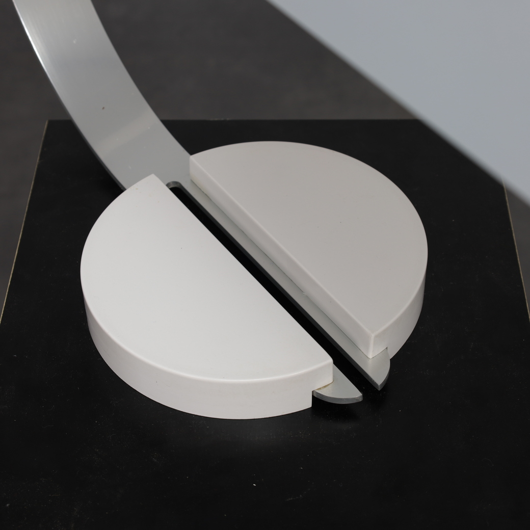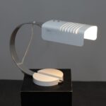 Designed by Paolo Caliari for Linea T Milano in the 1970s, this elegant desk lamp captures the refined technical aesthetic that defined Italian industrial design during the decade. The sleek aluminium shade, pierced with rhythmic light slits, rests on a sculptural curved frame that gives the lamp a sense of weightless balance.