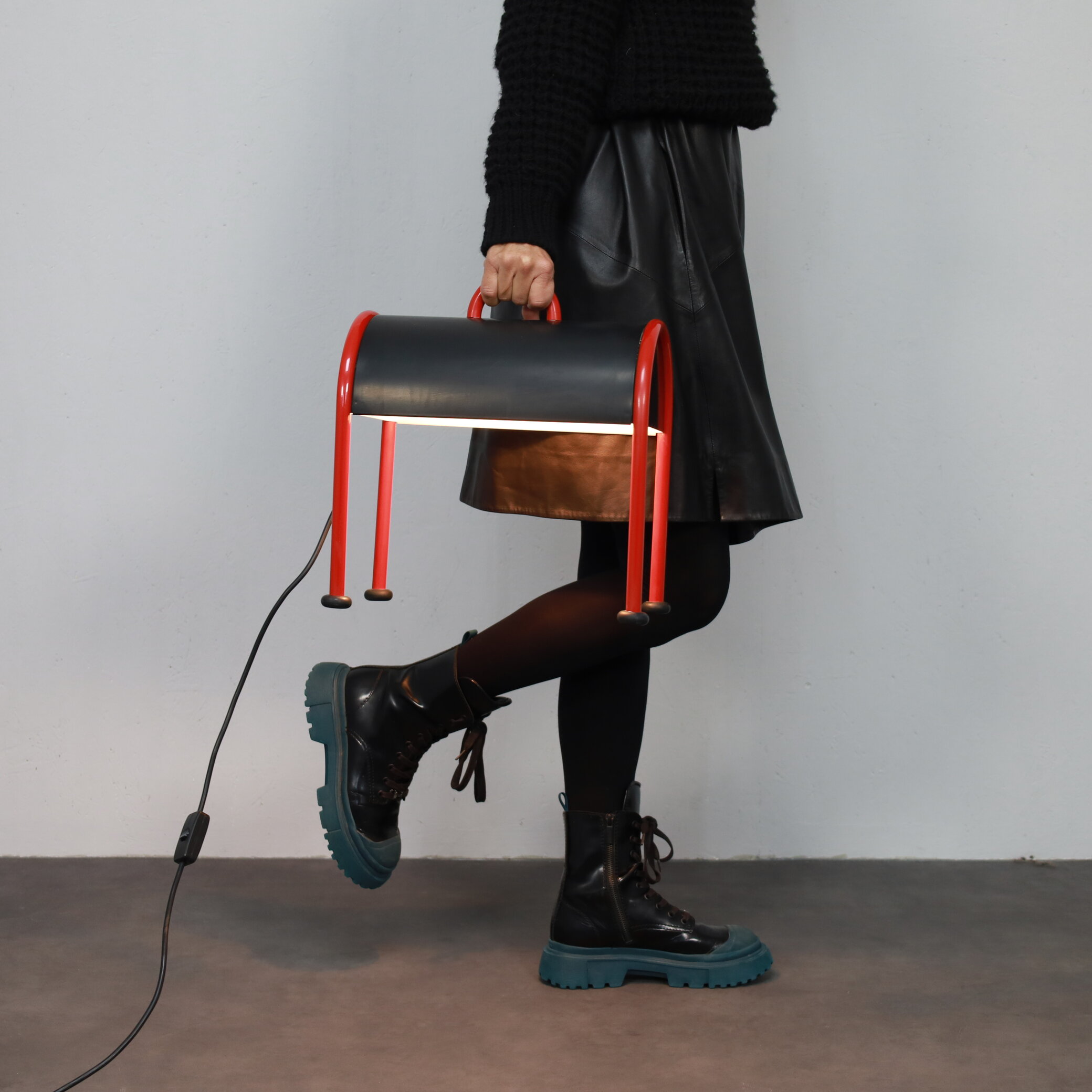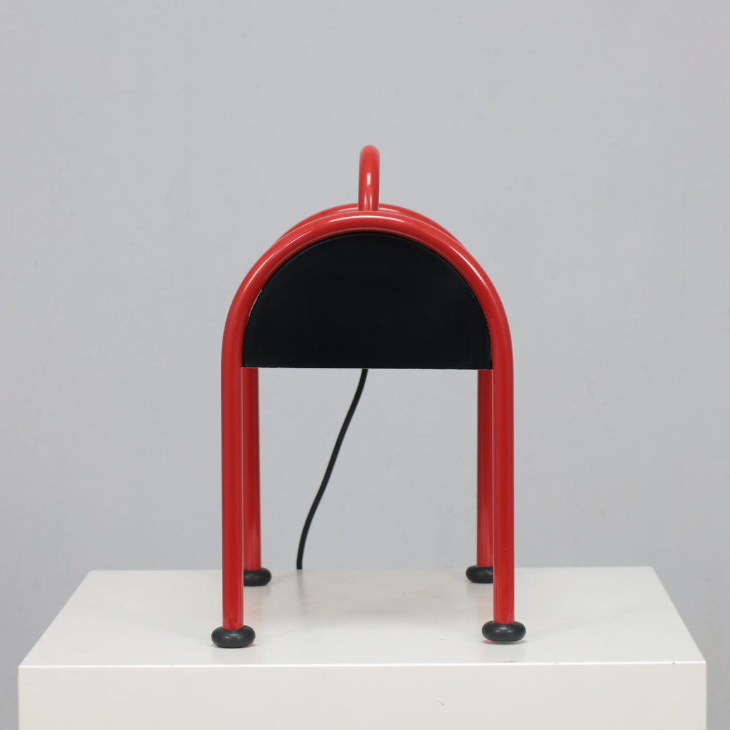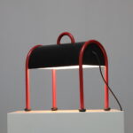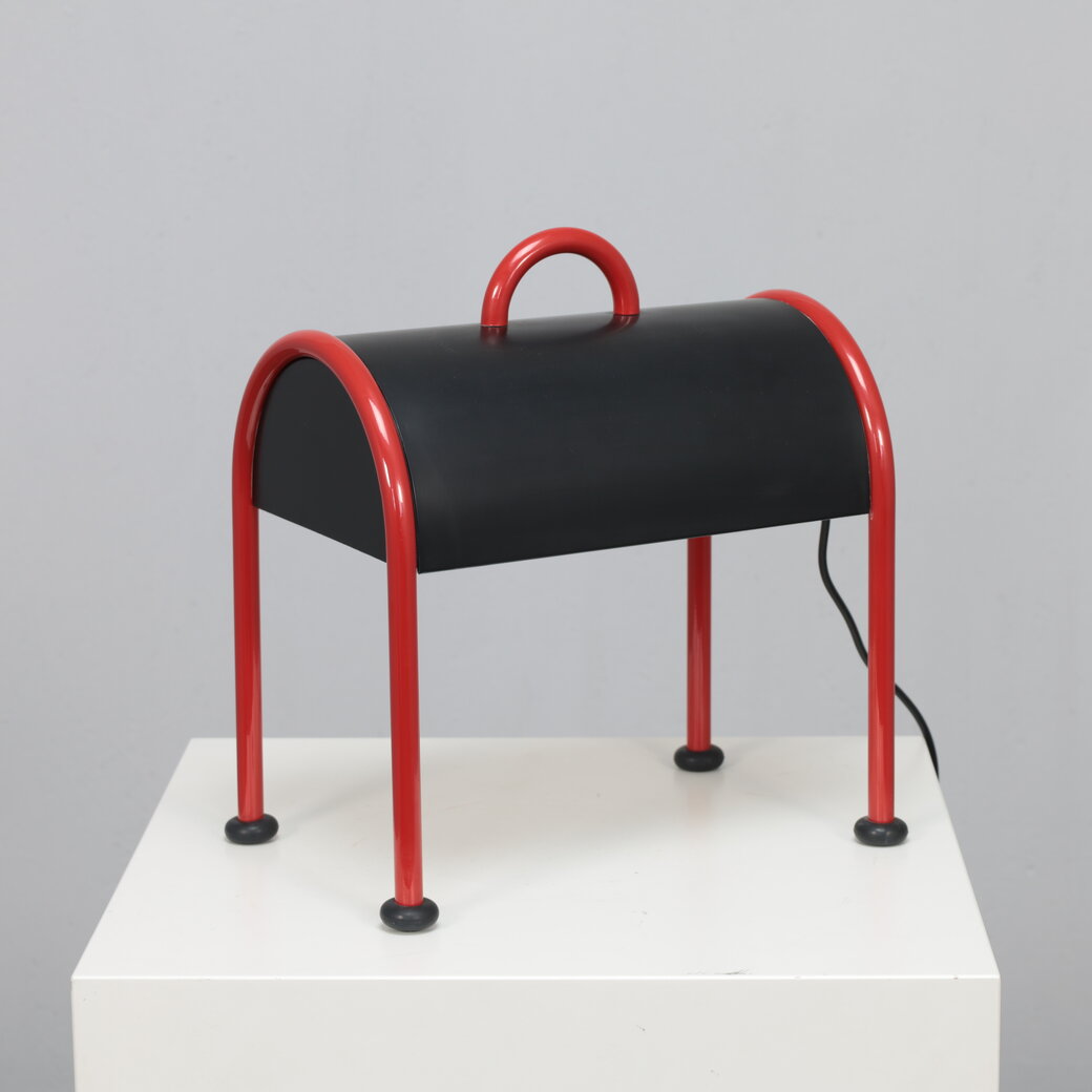 Designed by Ettore Sottsass for Stilnovo in 1977, the Valigia (Italian for “suitcase”) is one of the most recognizable icons of Italian postmodern lighting. With its curved black metal body resting on vibrant red tubular legs, the lamp exudes a sense of humor and optimism as if ready to travel, a portable piece of design poetry.