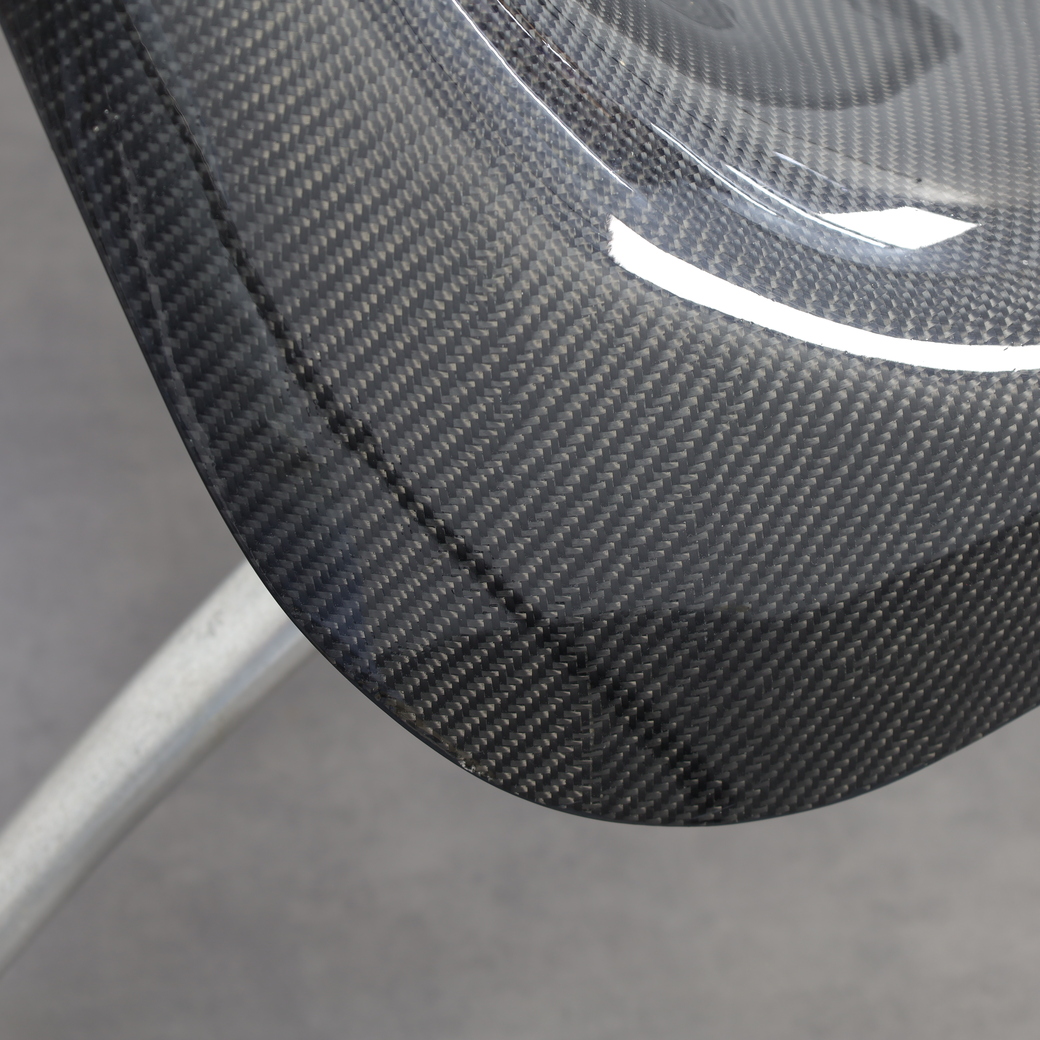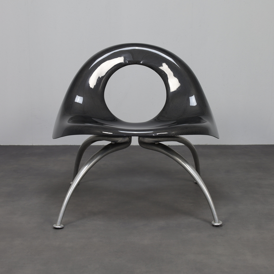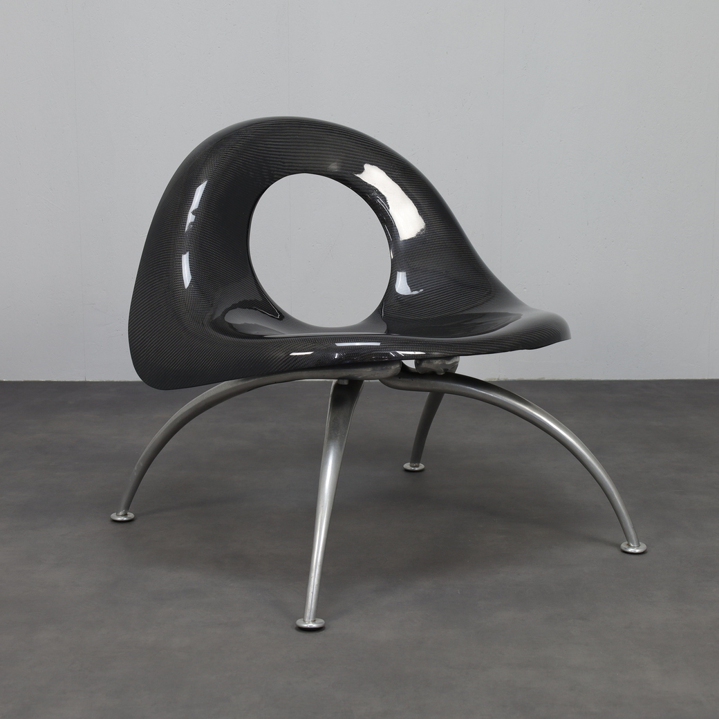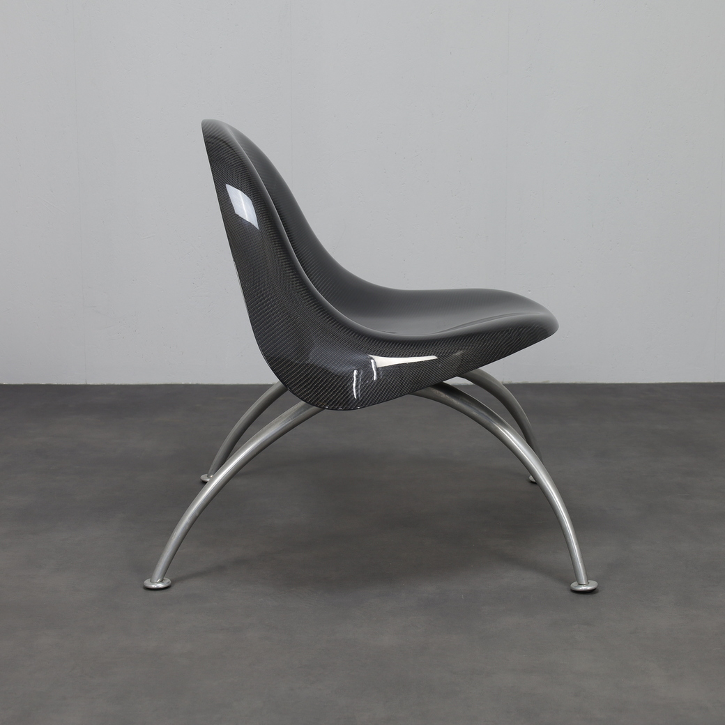 The “Elephant” lounge chair is a very rare and extraordinary statement piece where futuristic form and advanced materials converge. Designed by Herbert Schultes for Lensvelt, the chair features a sculptural carbon fibre shell, its smooth, reflective surface accentuated by a dramatic central cut-out. Resting on arched aluminium legs, it evokes both strength and lightness, combining biomorphic inspiration with industrial precision.