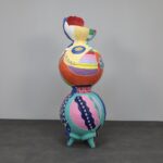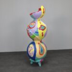 This striking papier-mâché sculpture radiates joy and energy through its bold palette of bright reds, greens, blues, and yellows. The playful, totemic form composed of stacked organic shapes is adorned with hand-painted geometric and abstract patterns, recalling the exuberant spirit of Niki de Saint Phalle’s iconic work. Both sculptural and painterly, this piece becomes a celebration of color, form, and movement. A unique and decorative artwork that instantly transforms its surroundings.